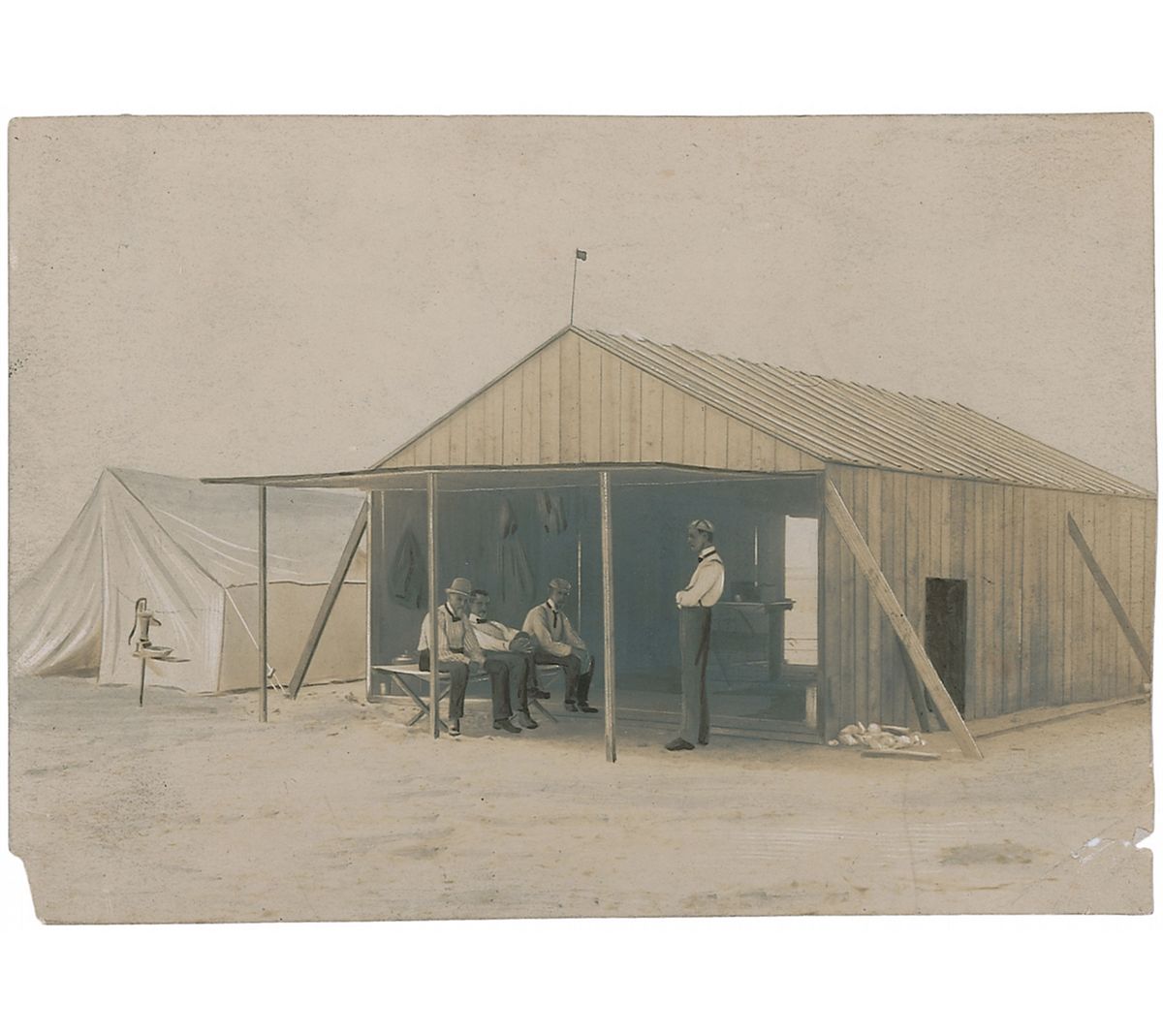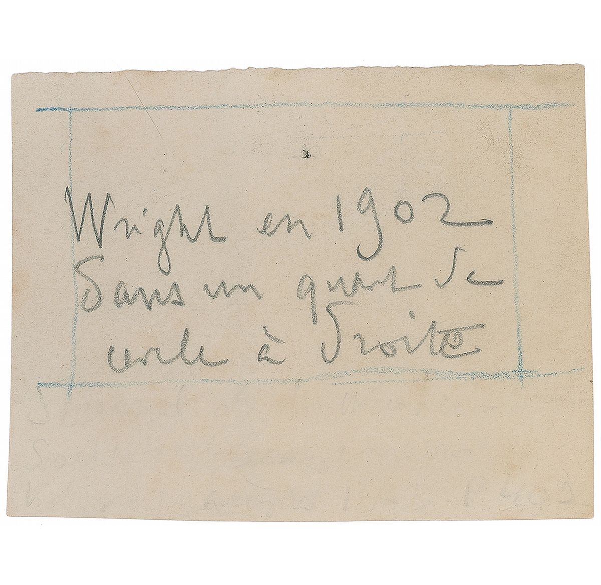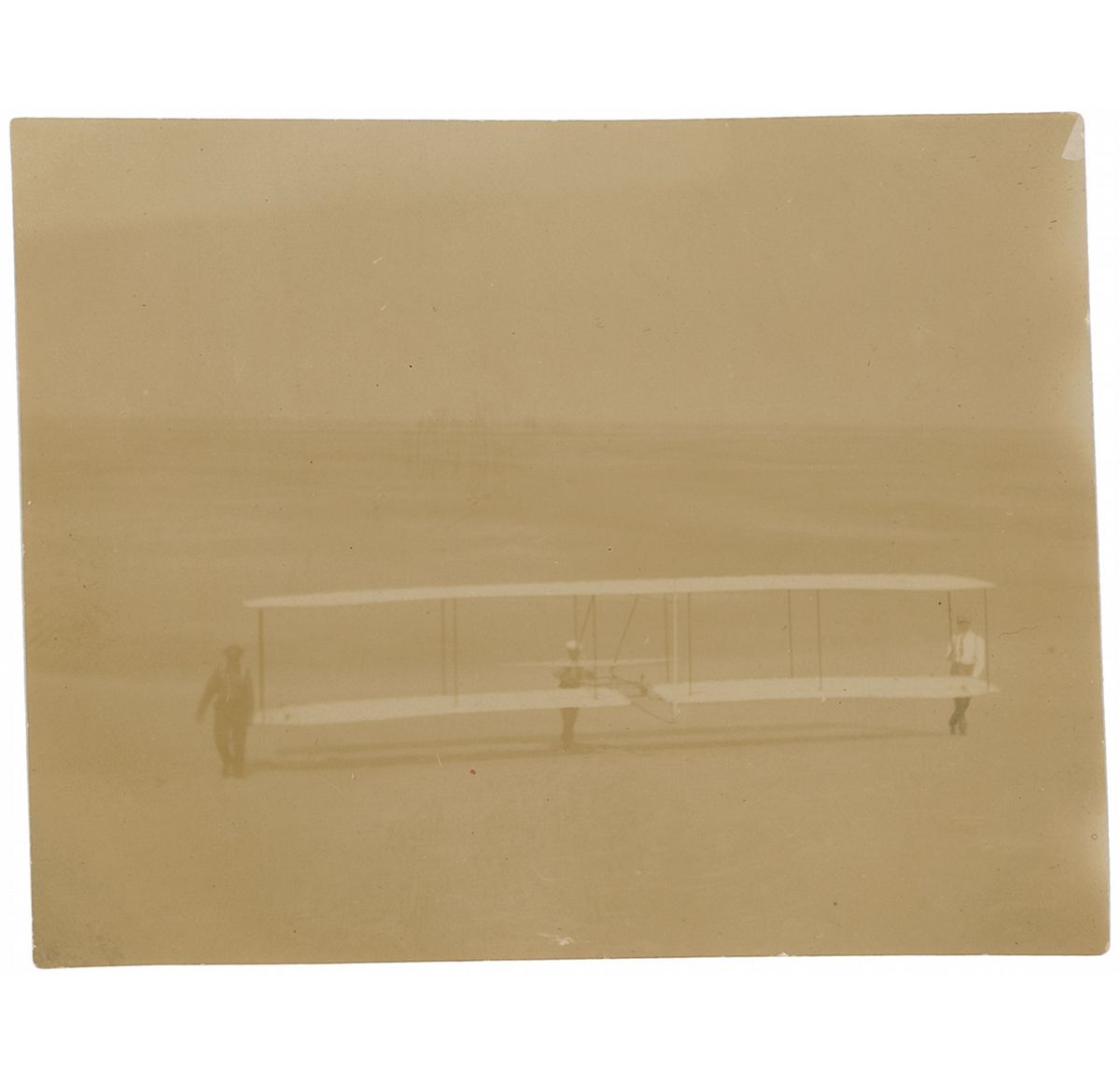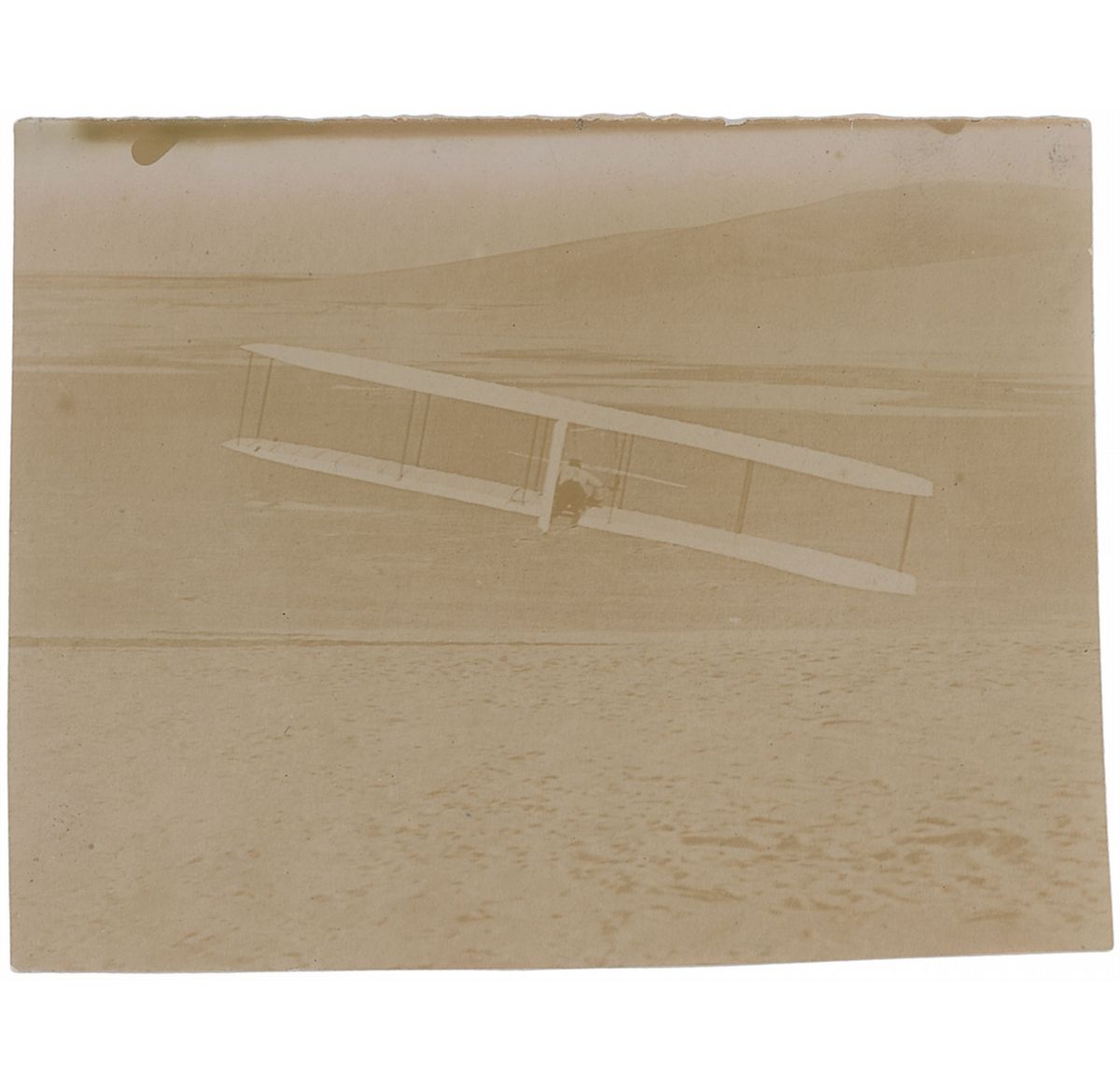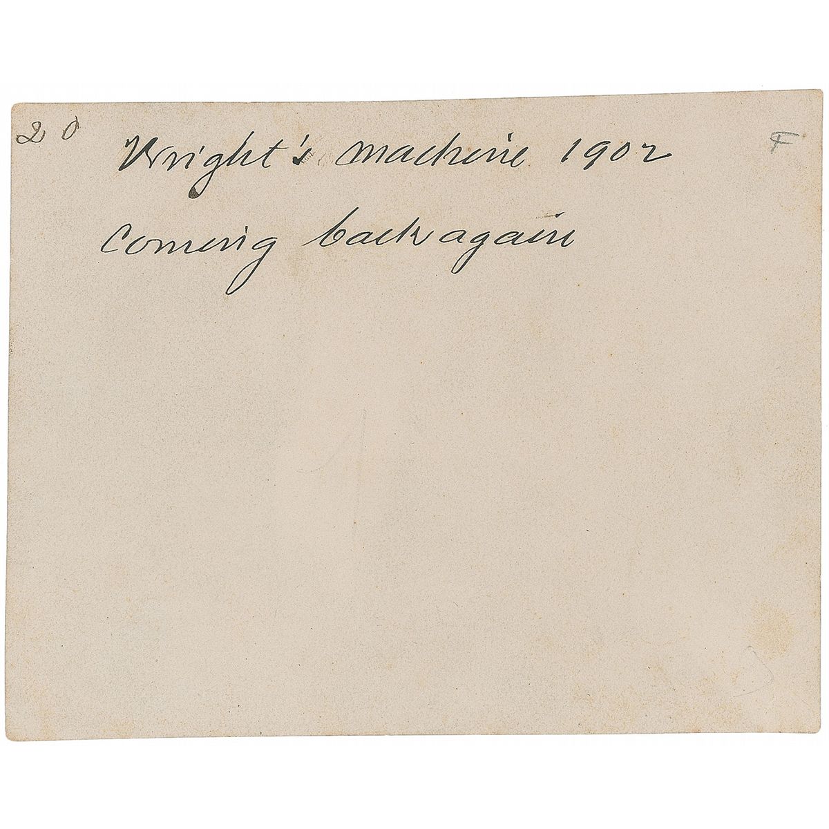 Four historic original photos of the Wright Glider experiments at Kitty Hawk in 1902, 4.5 x 3.5, with three photos of the glider and one showing Octave Chanute and a group of other men under a tent. Two images show the glider in flight, one of which is known to show Wilbur Wright piloting the glider on October 24, 1902, making a right turn; this photograph is notated in French on the back by Captain Ferdinand Ferber in pencil, in part, “Wright en 1902.” The third image of the glider depicts it on the ground with two men, notated on the reverse in black ink by Chanute, “Wright’s machine 1902, coming back again.” In overall fine condition. Ferber was an officer in the French Army who—despite the fact that his own attempts at building aircrafts were largely unsuccessful—proved to be a major influence in the development of aviation in France by publicizing the work of the Wright Brothers and raising public interest in manned flight. Chanute was an American aviation pioneer who had conducted his own glider experiments in the late 1890s and later became an avid supporter of the Wright Brothers, frequently offering them engineering advice and visiting them at Kitty Hawk. A unique grouping associating these influential champions of aviation.