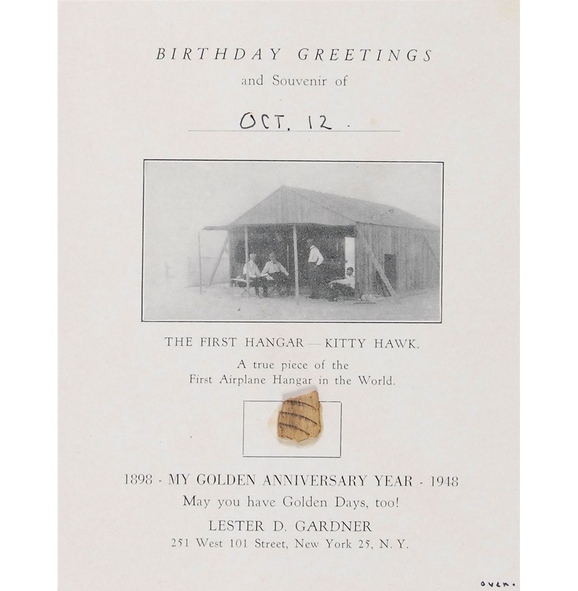 Very rare original wooden fragment from the Wright Brothers’ first hangar at Kitty Hawk, affixed to a 4.25 x 5.5 printed birthday card from Lester D. Gardner. Souvenir card features an image of the hangar, captioned, “The First Hangar—Kitty Hawk, A true piece of the First Airplane Hangar in the World!” Printed at the bottom is: “1898—My Golden Anniversary Year—1948, May you have Golden Days, too! Lester D. Gardner.” The card is dated October 12 and signed in black ink on the reverse, “A little late but with our love and best wishes, Lester.” In fine condition. Gardner personally knew Orville Wright and held many prestigious positions—he served on the corporate board of MIT and edited numerous aviation journals, including Who’s Who in American Aeronautics. Orville also entrusted Gardner with the famous bolt of wing fabric from the 1903 first flight for distribution to a select few. A scarce offering with research indicating only one other example sold in the last 10 years.