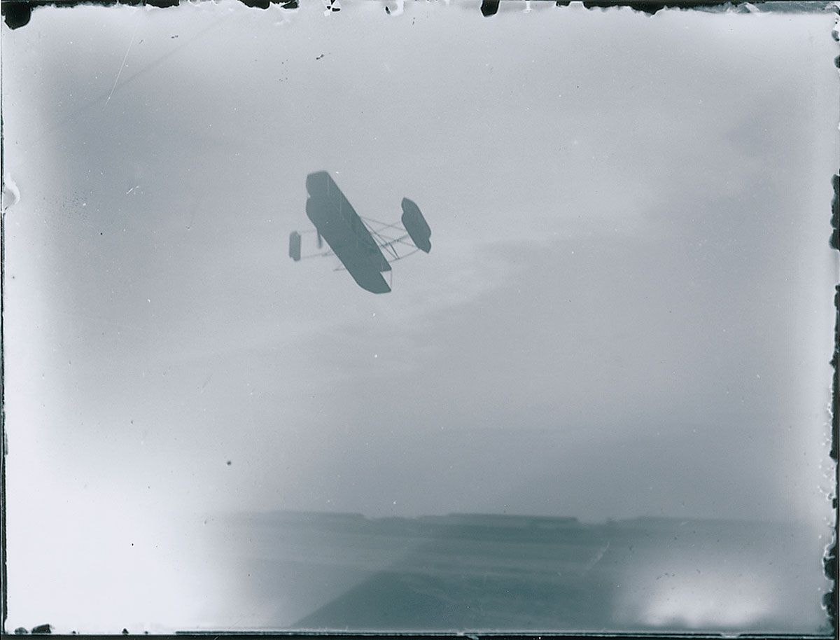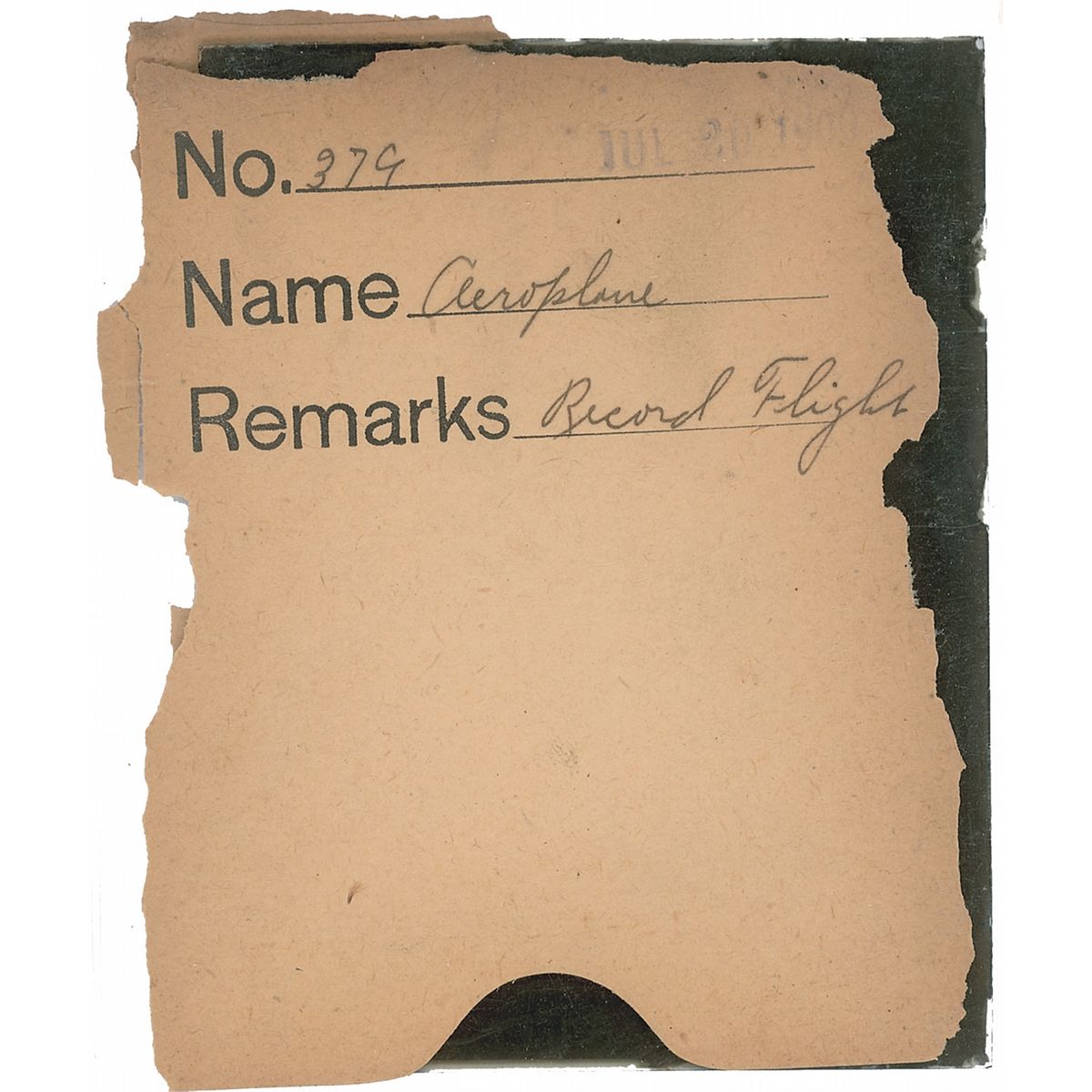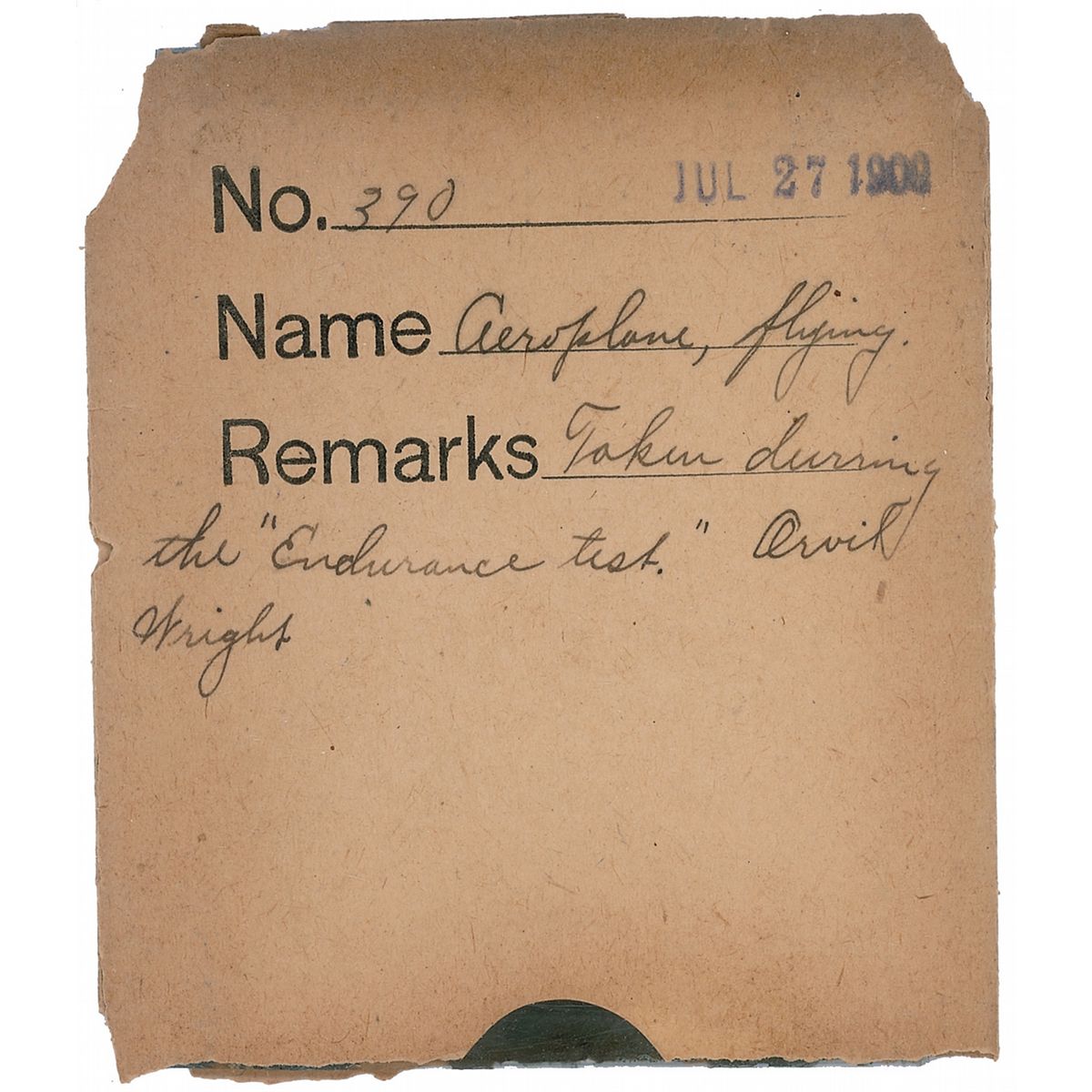 Two historically important original 4.25 x 3.25 glass negatives depicting the Wright Model A Military Flyer in flight during July, 1909, both contained in their original paper sleeves. First is labeled “No. 379, Name: Aeroplane, Remarks: Record Flight,” and is stamp-dated July 20, 1909. Second is labeled “No. 390, Name: Aeroplane, flying, Remarks: Taken during the ‘Endurance Test.’ Orvil [sic] Wright,” and is stamp-dated July 27, 1909. Edge chipping and separations to brittle paper sleeves, and some emulsion loss to edge of negatives, otherwise overall fine condition. Accompanied by two modern prints of these images. In 1909, the Wright Brothers brought their airplane to Fort Myers for War Department Trials. On July 27, Lieutenant Frank Lahm joined Orville Wright as a passenger for the official flight test—during which they set the record for the longest two-man flight: one hour, twelve minutes, and forty seconds. During the speed test, Wright flew at over 42 miles per hour, exceeding the Army’s contract specifications. These unique negatives depict a truly groundbreaking moment in aviation and military history—after passing the rigorous testing requirements, the plane was purchased for $30,000 and designated as ‘Signal Corps No. 1,’ on August 2, 1909.