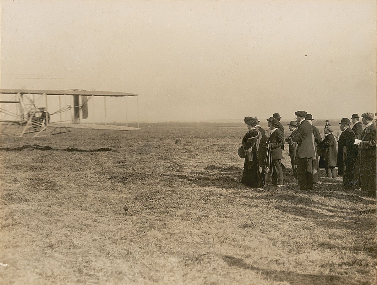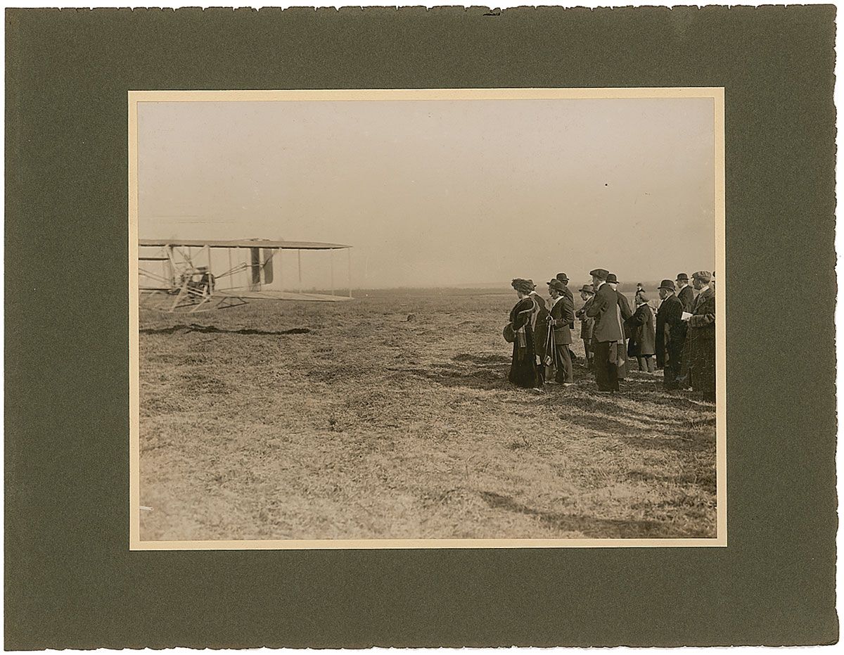 Original glossy 9.25 x 7 photo of a Wright Flyer just feet off the ground as a crowd looks on, presumably taken from a demonstration in France. Photo is affixed to a 13.5 x 10.25 mount. In fine condition, with a bit of scattered light wear to finish.