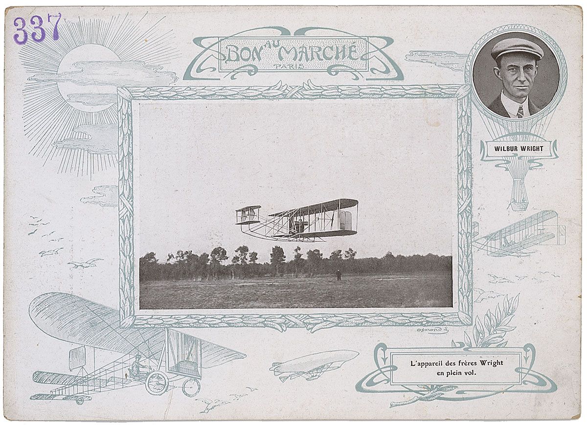 Original French advertisement broadside, 9.75 x 7, featuring an image of Wilbur Wright and the Wright Flyer on one side, headed across the top, “Bon au Marche Paris,” with printed information on the reverse, in French, with the front also stamped “337.” Scattered light soiling, a bit heavier to reverse, otherwise fine condition.