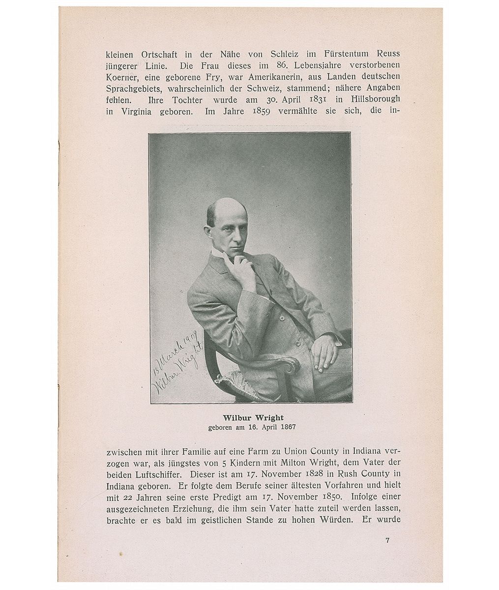 Rare original German booklet entitled “Die Bruder Wright,” with cover translating to: “The Wright Brothers. A study of the development of the flying machine from Lilienthal to Wright,” 6 x 9, 64 pages, published in Berlin in 1909. Inside bears 44 illustrations, many of the Wright Brothers and their machine. In fine condition, with scattered toning and soiling to covers, and a small label affixed to bottom of covers.