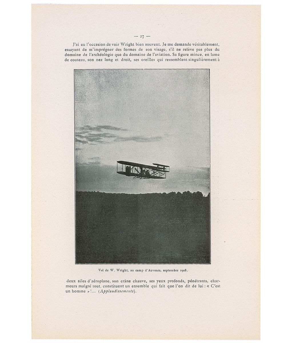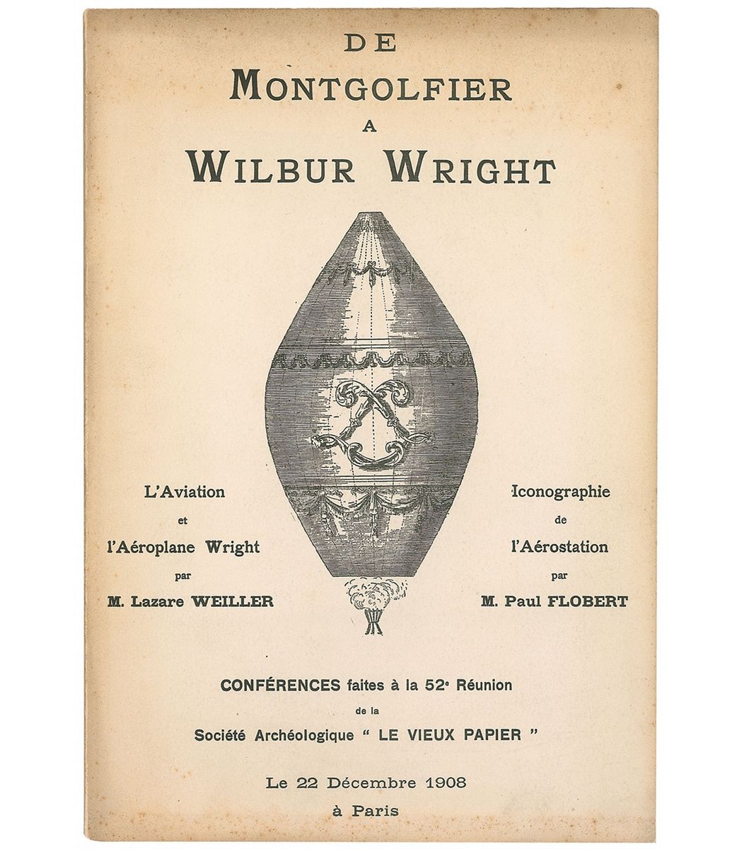 Original limited edition French booklet entitled “De Montgolfier a Wilbur Wright,” 7.5 x 10.75, published in Paris and dated December 22, 1908, numbered 254/300, with several images of Wilbur Wright and the Wright Flyer inside. In fine condition, with scattered light toning and soiling to covers.