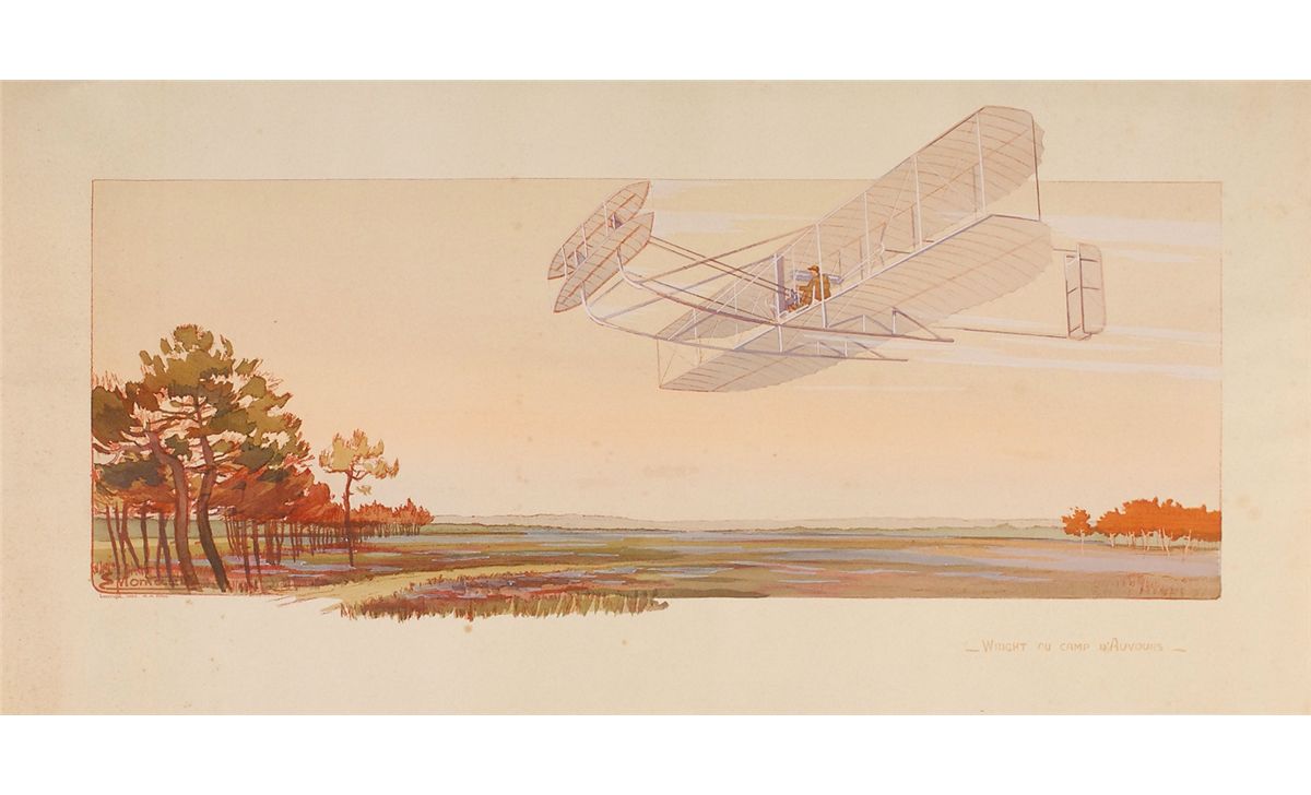 Magnificent color 34 x 16.5 lithograph by Ernest Montaut entitled ‘Wright au Camp d’Auvours,’ printed in Paris circa 1908, soaring over the Camp d’Auvours artillery field east of Le Mans during his demonstration flights in late 1908. In fine condition, with unobtrusive scattered foxing. It was at Camp d’Auvours that Wilbur Wright set and broke his own endurance records. A fabulous oversized lithograph with soft, vibrant colors that capture the dreamlike essence of early manned flight.