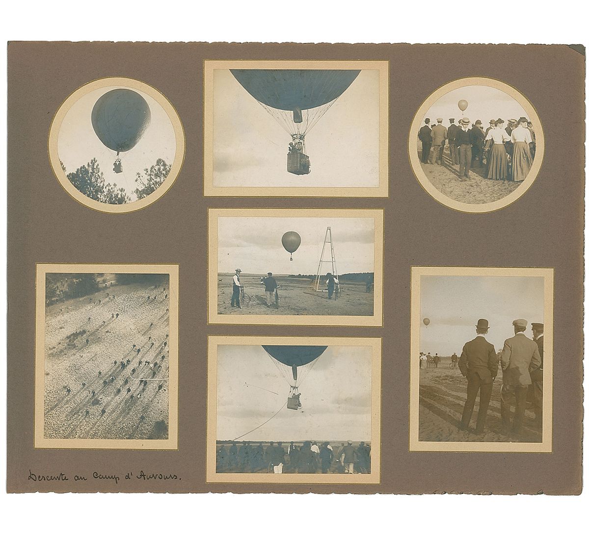 Collection of seven original photos of a hot air balloon exhibition over the Wright’s Camp d'Auvours, including one taken from the basket of the balloon showing the spectators in the field below. All photos are affixed to a 13.5 x 10.5 scrapbook page. In fine condition.