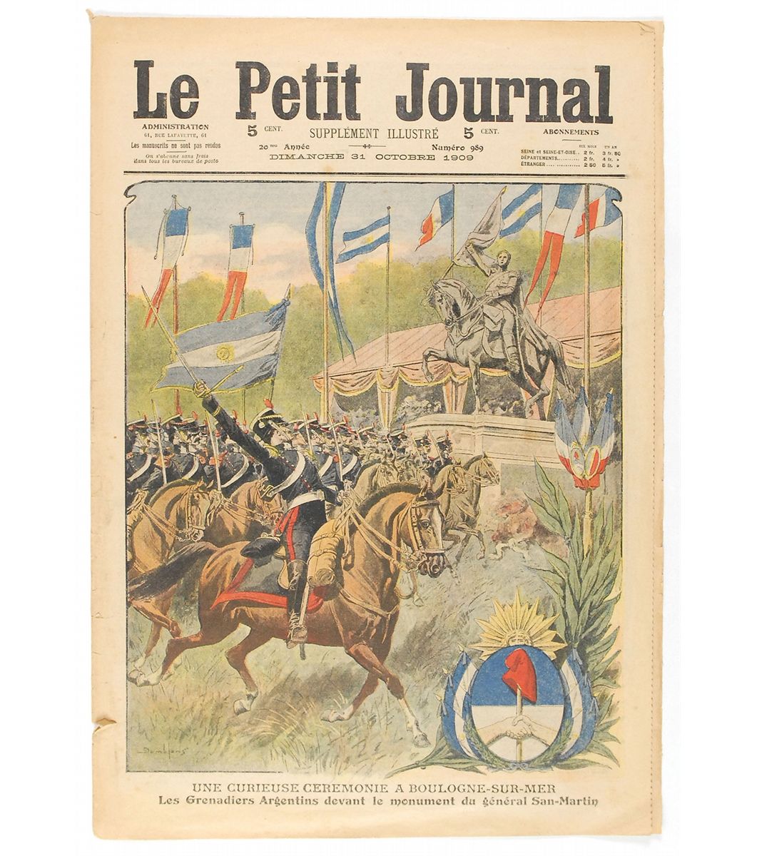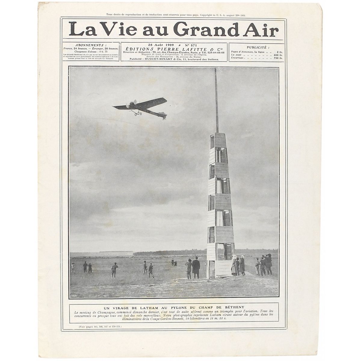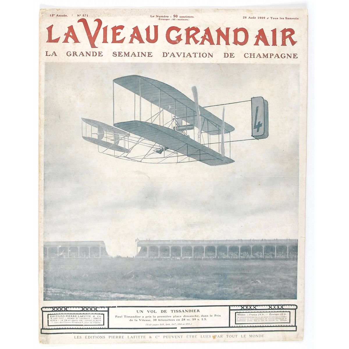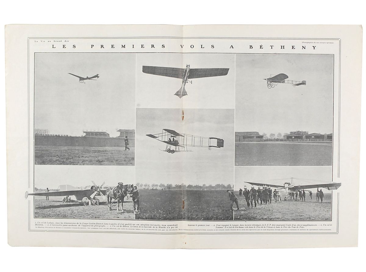 Two French publications: an issue of La Vieau Grand Air magazine, 11 x 14, 15 pages, August 28, 1909, depicting Paul Tissandier in flight on the front cover and featuring a number of large aviation images inside, with subjects including Tissandier, Hubert Latham, and Louis Bleriot; and an issue of Le Petit Journal,12 x 17.5, three pages, featuring a full-page color image of Charles de Lambert’s famous flight over Paris and around the Eiffel Tower. In overall very good condition, with scattered foxing and small edge tears.