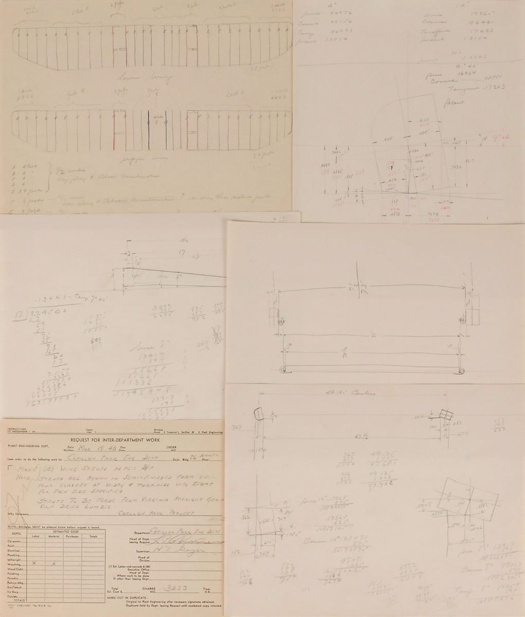 Highly appealing set of five original pencil sketches by Louis P. Christman, chief production engineer of the Wright Aeroplane Co., on individual off-white sheets, each measuring 8.5 x 11 and 11 x 8.5, and featuring various diagrams, notes, and calculations made by Christman while he worked on restoration designs of the 1905 Wright Flyer III at the Smithsonian in Washington, D. C. Also includes a "Request for Inter-Department Work," one page, 8.25 x 7.25, March 19, 1948, relating to a "Carillon Park Project" and signed in pencil by Christman and his supervisor Harvey D. Geyer. In overall fine condition. Christman began the restoration in 1947, and unveiled its completion at Carillon Park in Dayton, Ohio, in June 1950.