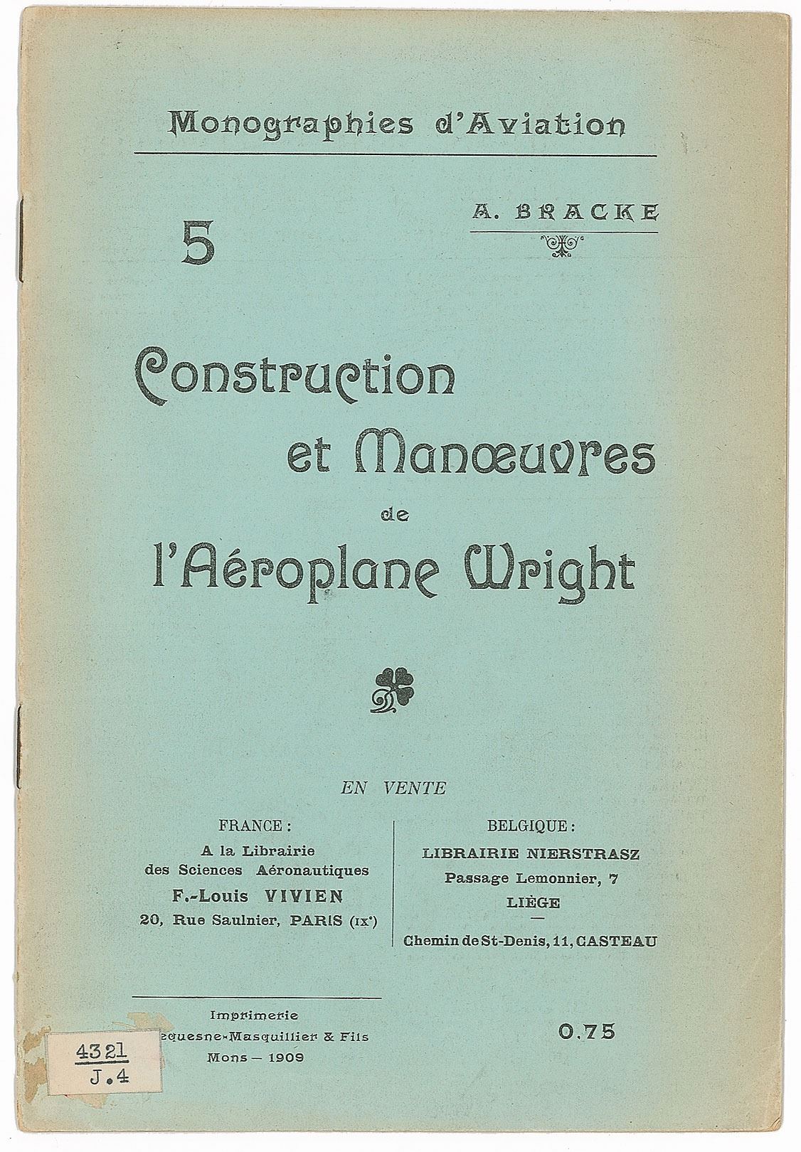 Booklet in French entitled Construction et Manoeuvres de l'Aeroplane Wright, Monographies d'Aviation #5, by A. Bracke, 6 x 8.75, 16 pages, published by Dequesne-Masquillier & fils in 1909. Light toning and a small label affixed to cover, and partial split to spine, otherwise fine condition.