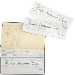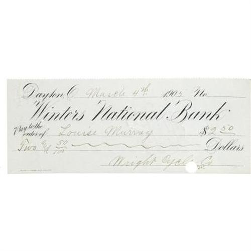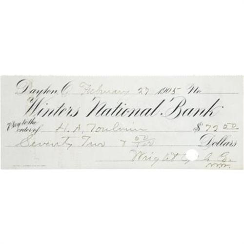 <B>Wright Cycle Company Checkbook and Two Canceled Checks.</B></I> Used during the critical period between 1904 and 1906, this checkbook reflects the exciting changes occurring in the lives of the Wright brothers of Dayton, Ohio. The account with the Winters National Bank was issued to the Wright Cycle Co., which began operations in 1892 as a bicycle manufacture and repair business. The brothers' interest in aviation eventually led them away from their focus on land-based locomotion, and between 1899 and 1905, the Wrights conducted a series of aeronautical experiments that led to the first successful powered airplane in 1903 and a refined, practical flying machine two years later. <BR><BR>The checkbook measures approximately 7 x 4.25" and is bound in worn blue cloth. The initial blank leaf contains notes and computations and is slightly age toned and soiled. The integral check register records checks made payable to a variety of businesses, including Rike Dry Goods, Dayton Lumber, Cooper Insurance, The New Era Gas Engine Co., and The New Era Iron and Engine Works. Each of these businesses contributed to the development of the Wright Flyer and modern aviation as we know it today. <BR><BR>Most importantly, the register notes a check for $25 payable to H.A. Toulmin, dated January 22, 1904, and a second check to Toulmin for $72.50, dated February 27, 1905 on which Wilbur Wright has penned his initials at the bottom.<BR><BR>As early as 1903 the Wright brothers attempted to patent their aircraft ideas, but their first application, which they wrote themselves, was rejected. On January 14, 1904, Wilbur Wright wrote to Springfield attorney Harry Aubrey Toulmin, Sr. requesting an appointment for advice and assistance with filing a new application. Eight days later, on January 22, Wilbur traveled to Springfield to see Toulmin, who took the Wright brothers' ideas about a patent for a flying machine seriously. Wilbur hired Toulmin that afternoon, writing the $25 retainer check mentioned above, and the Wright's patent case was placed in his able hands. After several years of dedicated effort by both Harry Toulmin and the Wright brothers, on May 22, 1906 they were granted U.S. Patent 821393 for a "Flying Machine." The resulting patent was a document that withstood one of the 20th century's fiercest legal battles over intellectual property rights.<BR><BR>Two canceled checks accompany this important item, both of which are reflected in the check register. The first is the $75, February 27, 1905 check to patent attorney Toulmin mentioned above, which bears his signature on verso. The second is a March 4, 1905 check for $2.50 payable to Louise Murray, also endorsed on verso. Both checks bear circular cancellation punch holes over the "<I>Wright Cycle Co</B></I>." signature and small tears where it appears the checks were impaled on some sort of three-pronged device (the tears on each check line up perfectly).<BR><BR>This awesome trio of items marks the very foundations of modern aviation, and is unique unto itself; it is certain to garner great interest on the part of every aviation collector.<BR><BR><b>Shipping:</b> Requires 3rd Party Shipping (<a target="_blank" href="http://www.heritageauctions.com/common/shipping.php">view shipping information</a>)