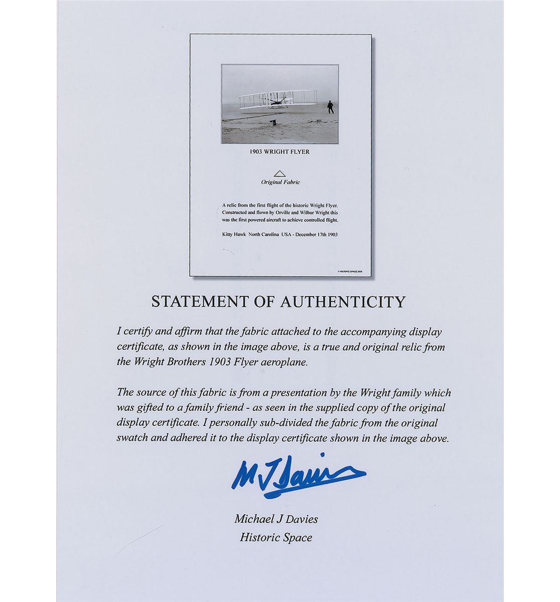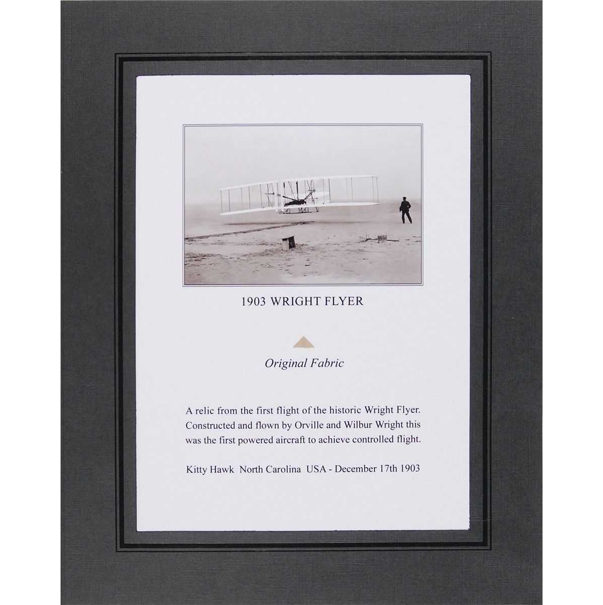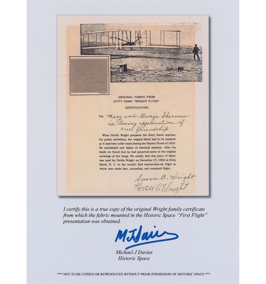 A small triangular swatch of wing fabric from the 1903 Wright Flyer that made the first heavier-than-air flight at Kitty Hawk on December 17, 1903. The relic is affixed to a 5.5 x 7.5 informational sheet and housed in its original folder. In very fine condition. Accompanied by certificates of authenticity from Michael Davies, who made the presentations from a larger swatch from the Wright family; one certificate includes a copy of the original presentation sheet from Susan and Horace Wright, reading, in part: “When Orville Wright prepared the Kitty Hawk machine for public exhibition, the original fabric had to be replaced as it had been under water during the Dayton Flood of 1913…After his death we found that he had preserved some of the original coverings of the wings.“