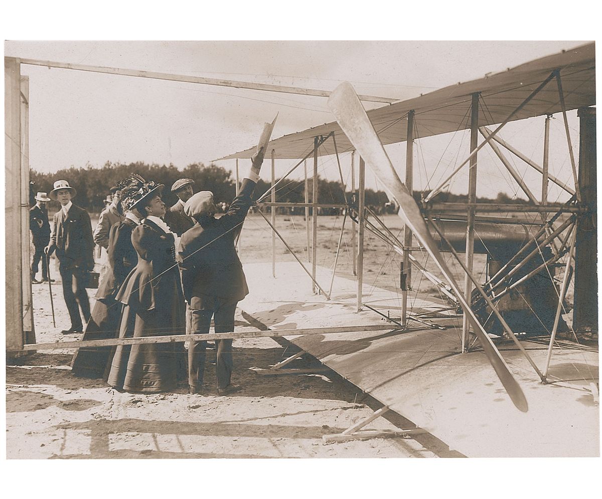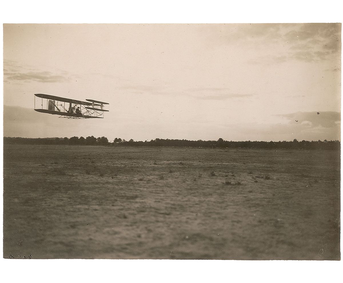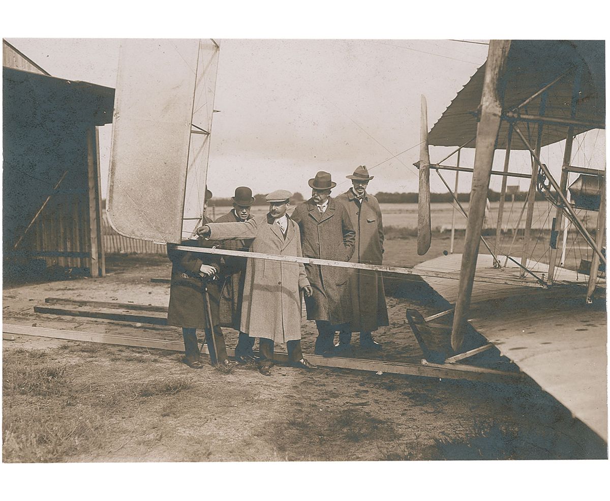 Three original press photos, all approximately 6.5 x 4.75, one showing the Wright flyer in the air, and the two others featuring their European agent Hart O. Berg showing off the flyer. Reverse of each photo bears short pencil notations and a photographer’s stamp. In fine condition.