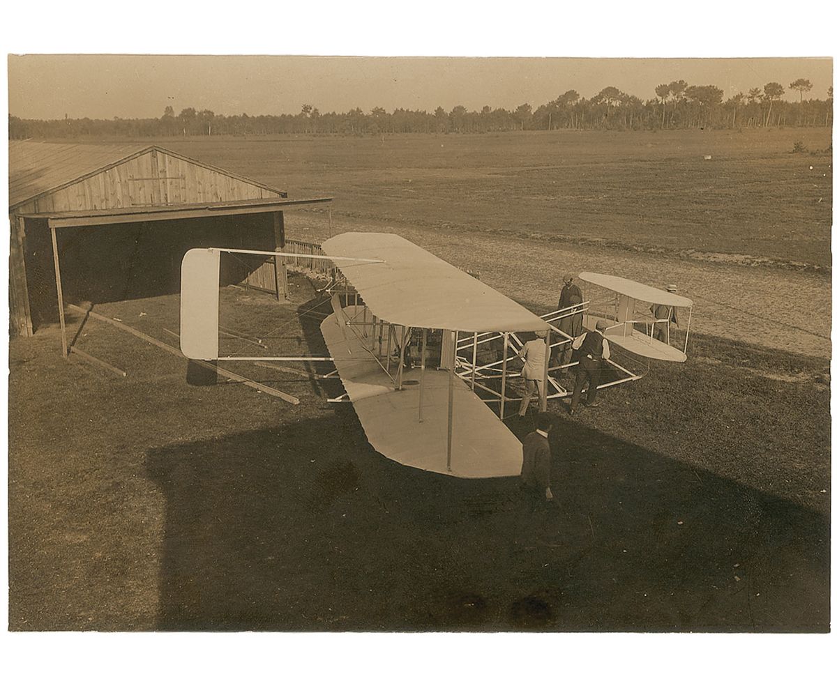Original 6.5 x 4.5 press photo of Wright’s Type A flyer being positioned outside a shed at the Hunaudieres race course near Le Mans, France, in August of 1908. Reverse bears a handwritten French notation and an M. Rol & Co. photographer’s stamp. In fine condition, with slightly trimmed edges.
