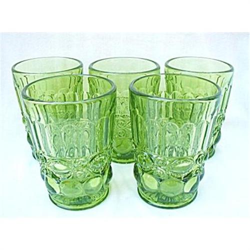 Eyewinker by L.G. Wright. These are the green 4 inch tall tumblers. I have 5 available and price is for set. Wright glass is becoming very collectible. This pattern is based on an 1890's motif popularized by the Dalzell, Gilmore and Leighton Co. of Findlay. Ohio according to the L.G. Wright book by James Measell and W.C. Red Roettis called The L.G.Wright Glass Company. 30 different Eyewinker pieces made from 1963 to 1968 in various colors.