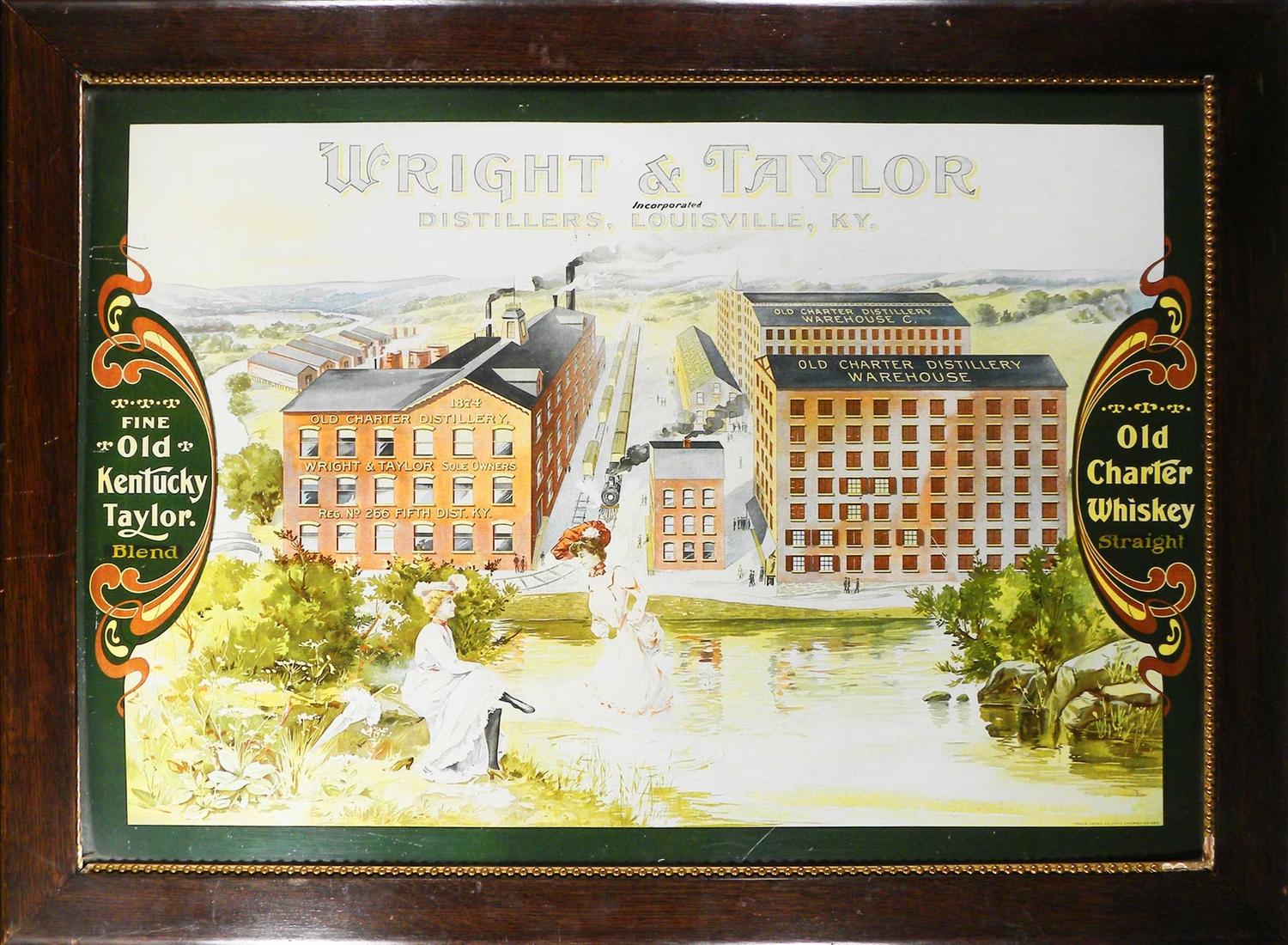 Wright & Taylor Distillers Tin Sign, depicting factory. Chas. W. Shonk Lithographer, Chicago. Left filet missing from frame and faded otherwise good condition. 39 X 28 1/2 inches overall.