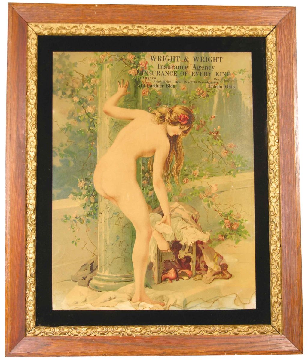 Wright & Wright Insurance Co., Toledo, Ohio Paper Sign. Depicting nude. Framed under glass, Excellent condition. 13 1/2 X 17 1/2 inches image only.