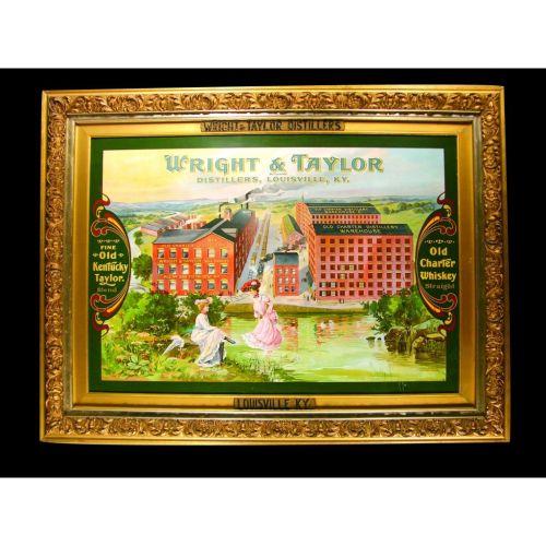 Wright and Taylor Distiller Tin Sign in original frame, Louisville, KY. By far the best known example of this Chas. W. Shonk Co. Lithograph, Chicago. In our opinion, this is among the top 10 Whiskey Distillery Signs ever produced and may well be one of the top 20 Tin Signs ever produced. The Graphics and Colors on this sign are absolutely spectacular. There is a Minor stain at 4:00. Other than that, it is in Near Mint Condition. 42 X 32 inches overall.