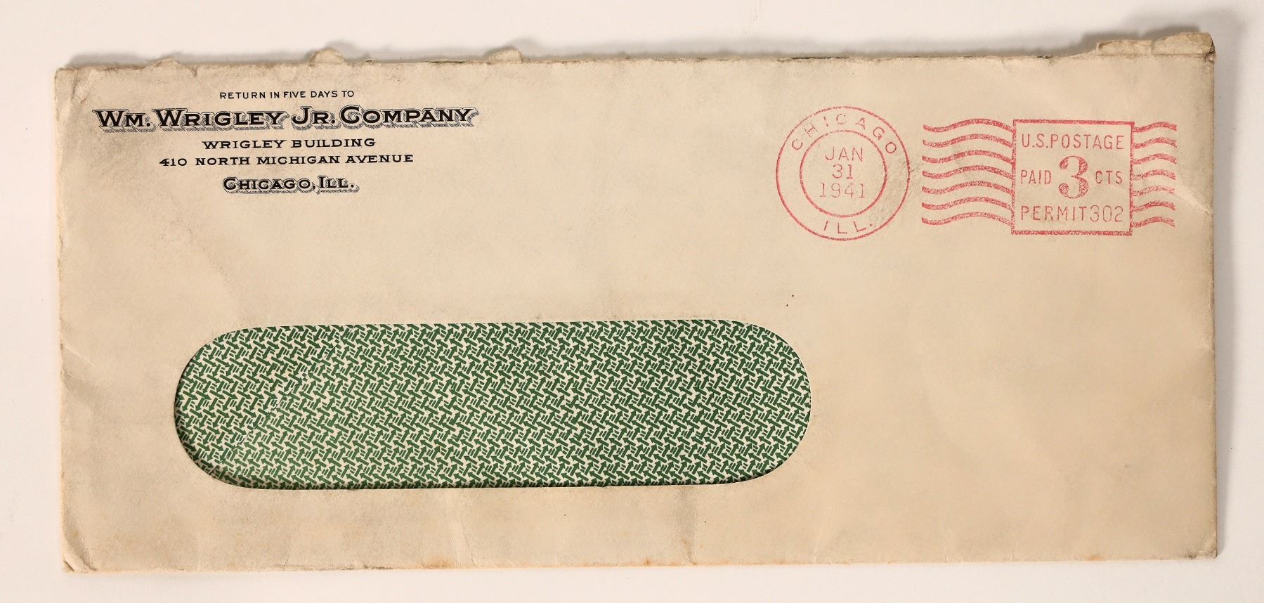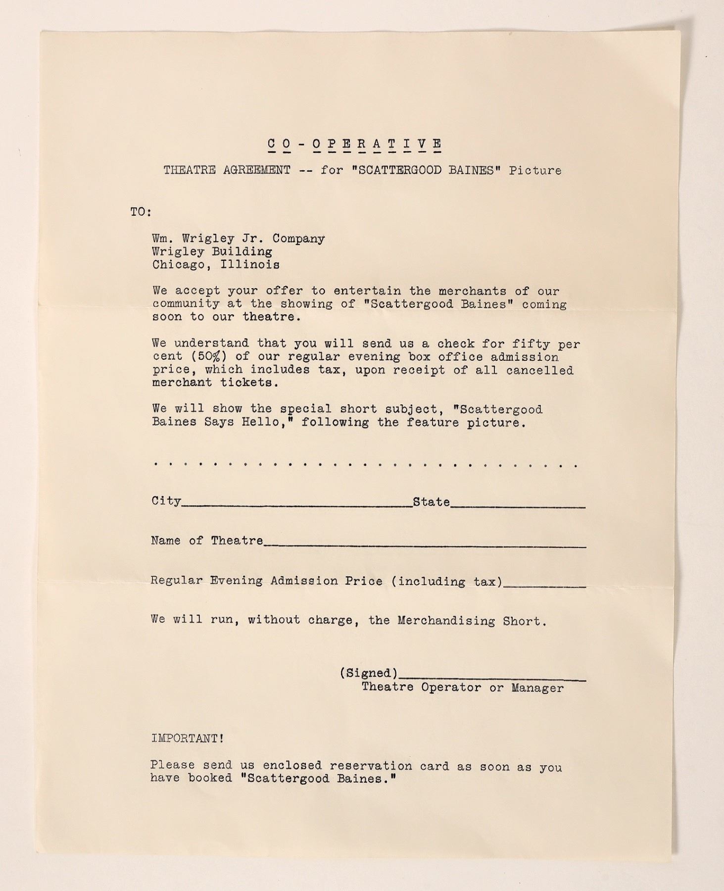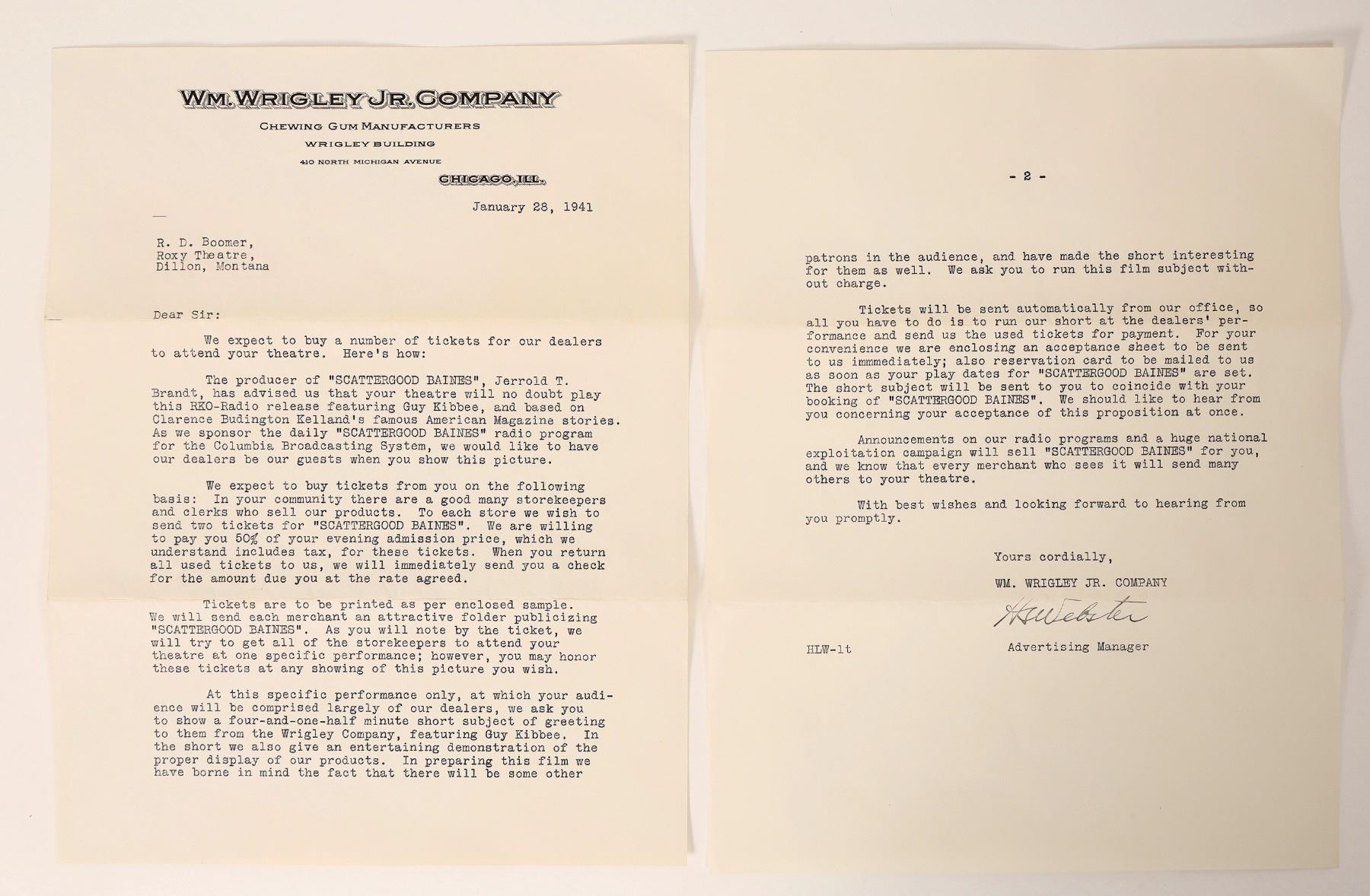 1941 Wm. Wrigley Jr. Company letter head related to tickets for a performance of Scattergood Baines along with a cover, sample ticket and contract.