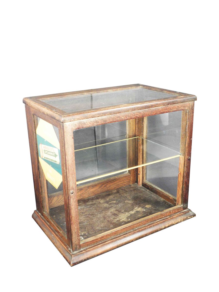 Wrigley's Gum Case. Oak with on glass shelf. Good original condition. 16 1/2 X 15 X 10 1/2 inches.