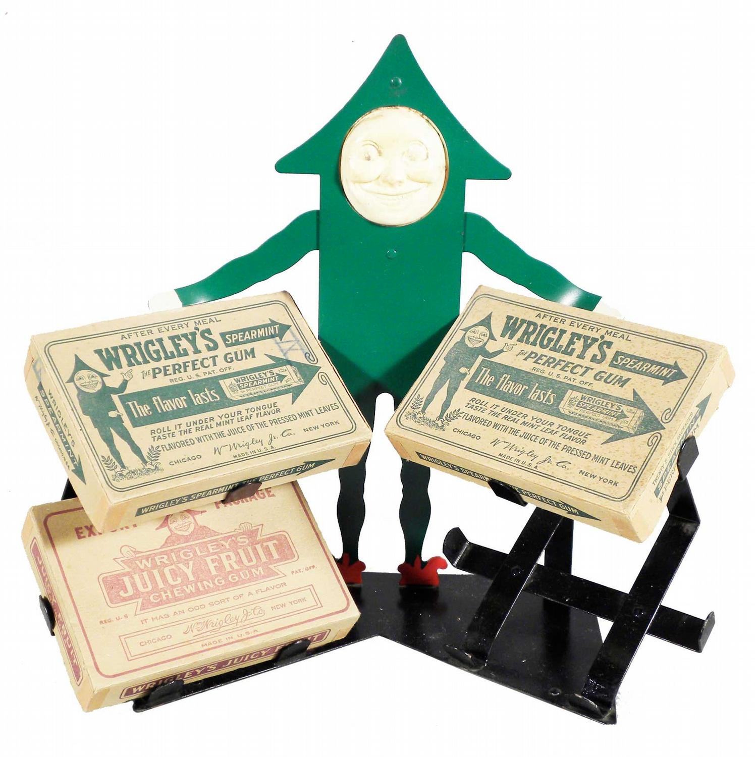 Wrigley's Gum Display Fixture. Holds four gum boxes, comes with three. Original celluloid face and repainted fixture. Excellent condition. 14 1/2 X 13 3/4 X 6 1/4 inches.