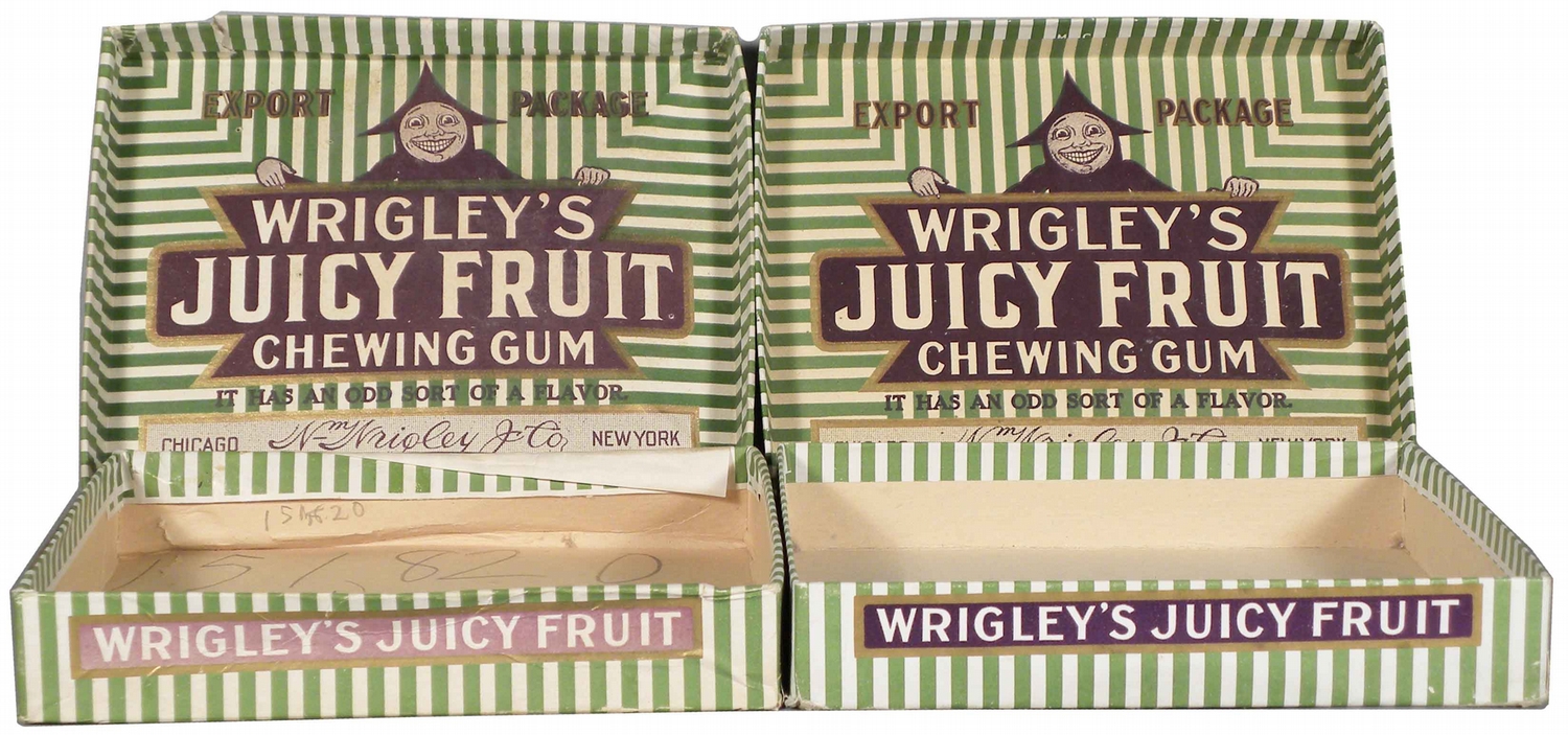 Wrigley's Juicy Fruit Chewing Gum Store Display Boxes. One box slightly faded is excellent the other top is separated from bottom and has pencil marks, good condition. 6 1/4 X 1 X 5 inches each.