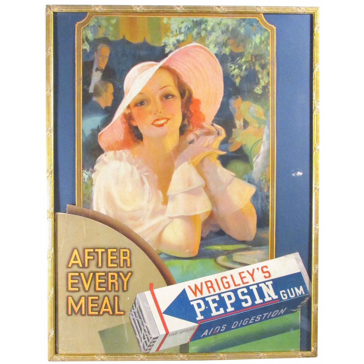 Wrigley's Pepsin Gum Die Cut Cardboard Sign. Some repairs otherwise very good condition. Framed under glass. 19 X 26 inches.