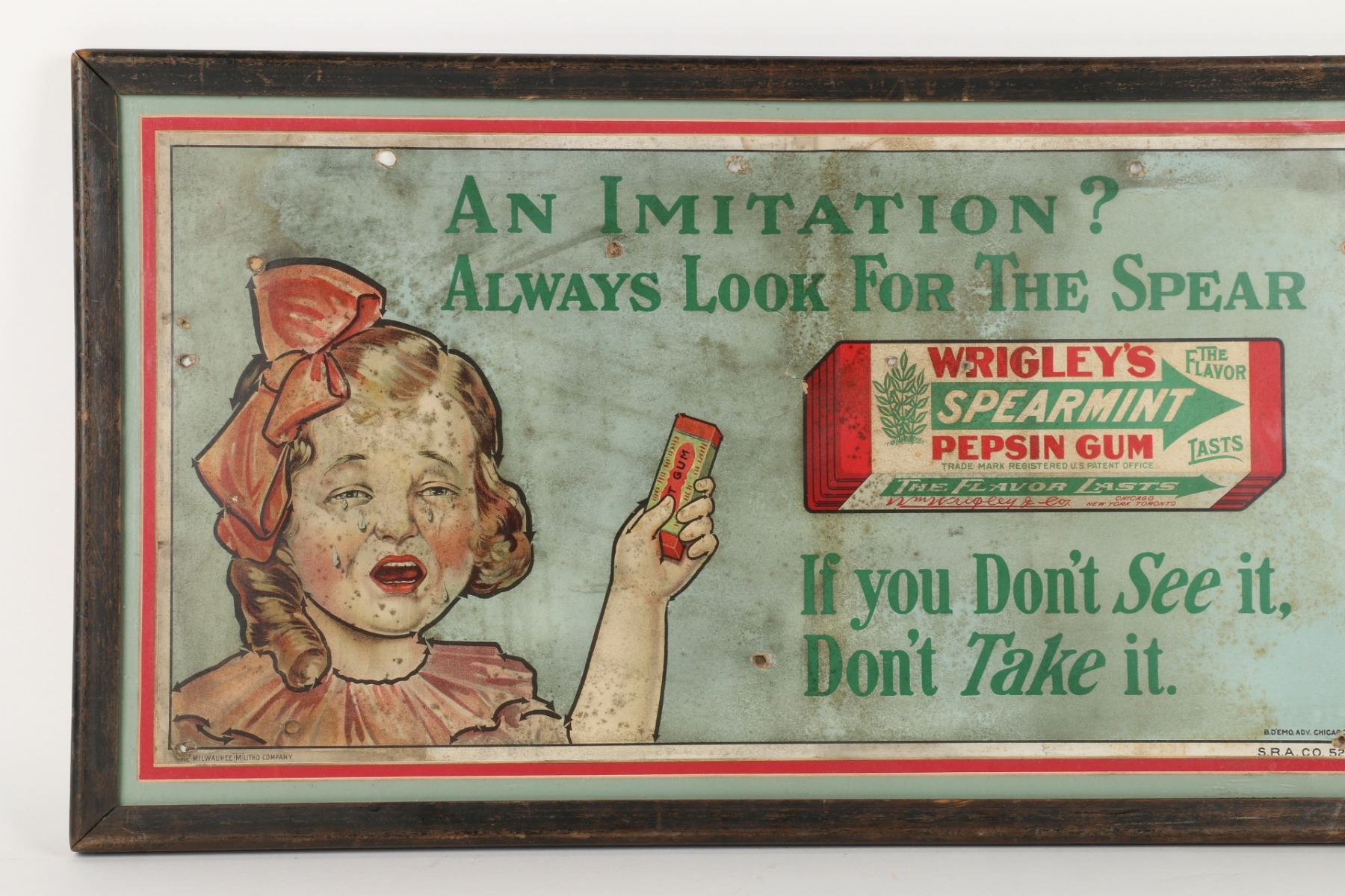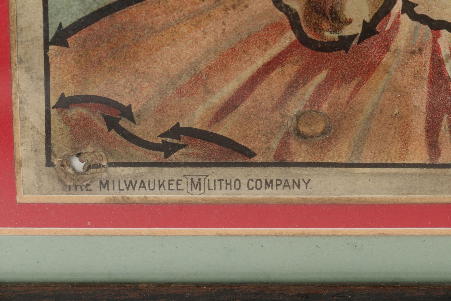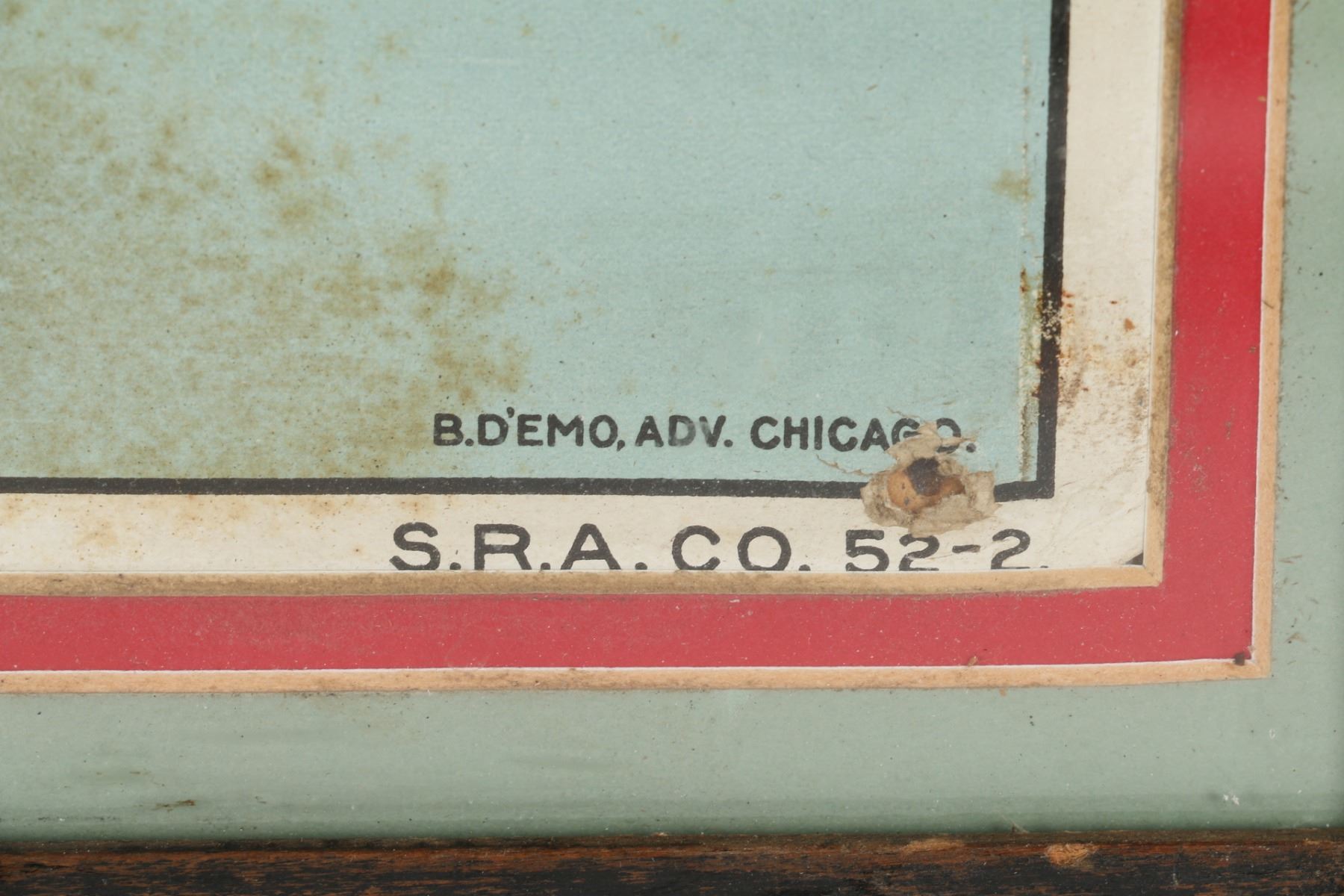 American. Rare. Marked, "The Milwaukee Litho Company - B.D Emo Adv Chicago - S.R.A Co 52-2", lower edge. Framed and matted cardboard under glass. 23" x 13" Several holes. Uniform soil and fading. $300-500.