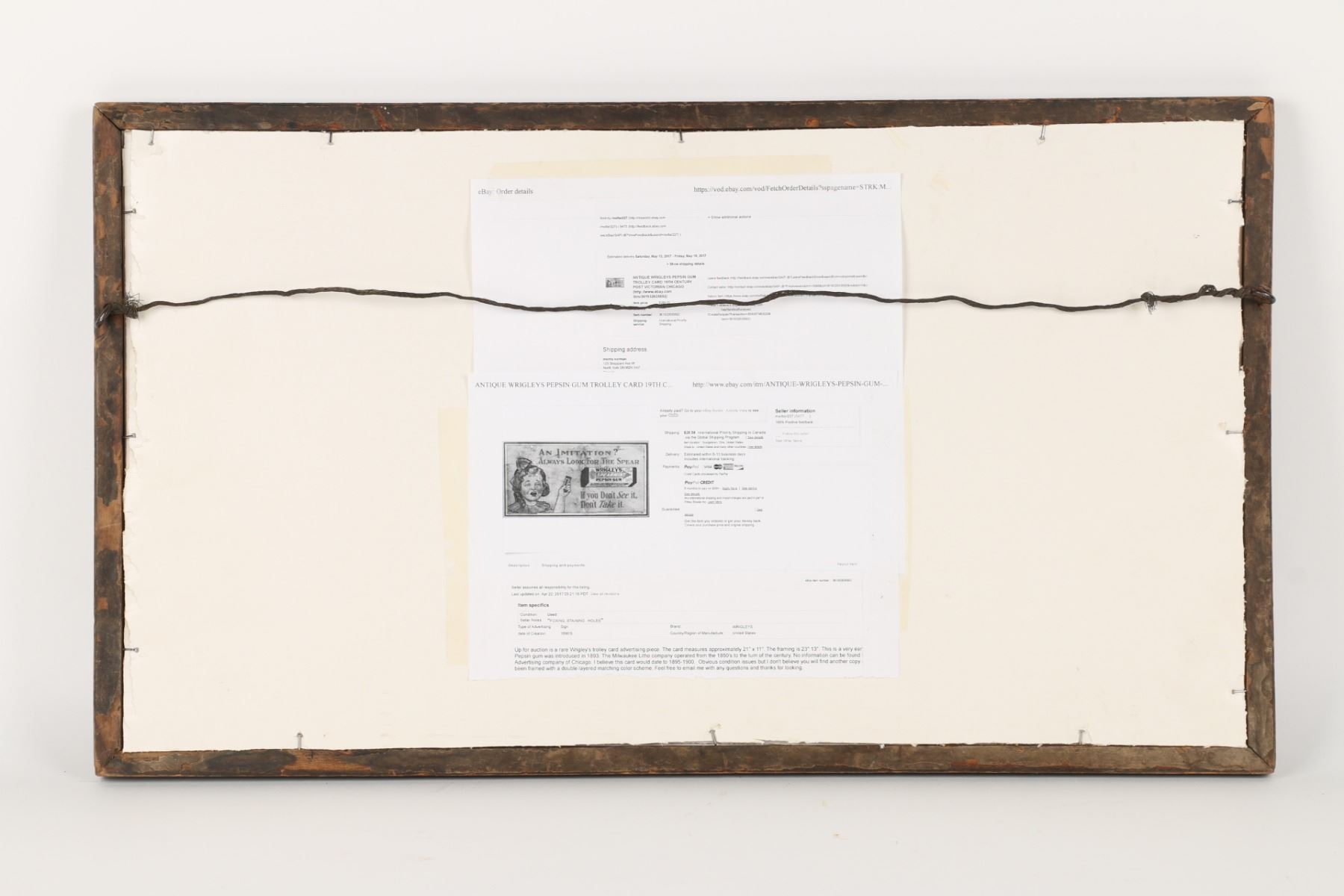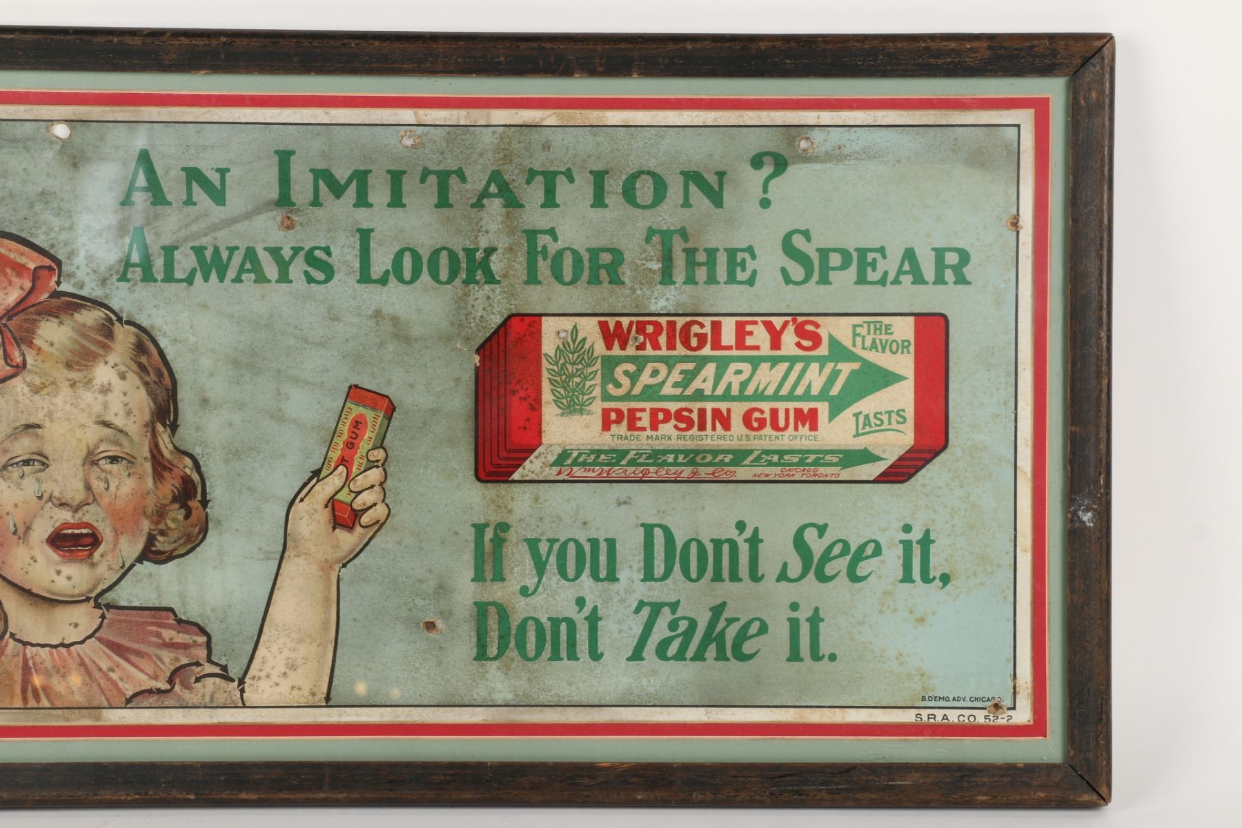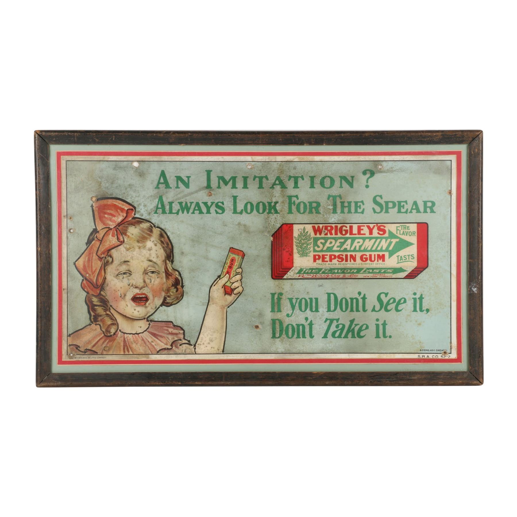 American. Rare. Marked, "The Milwaukee Litho Company - B.D Emo Adv Chicago - S.R.A Co 52-2", lower edge. Framed and matted cardboard under glass. 23" x 13" Several holes. Uniform soil and fading. $300-500.