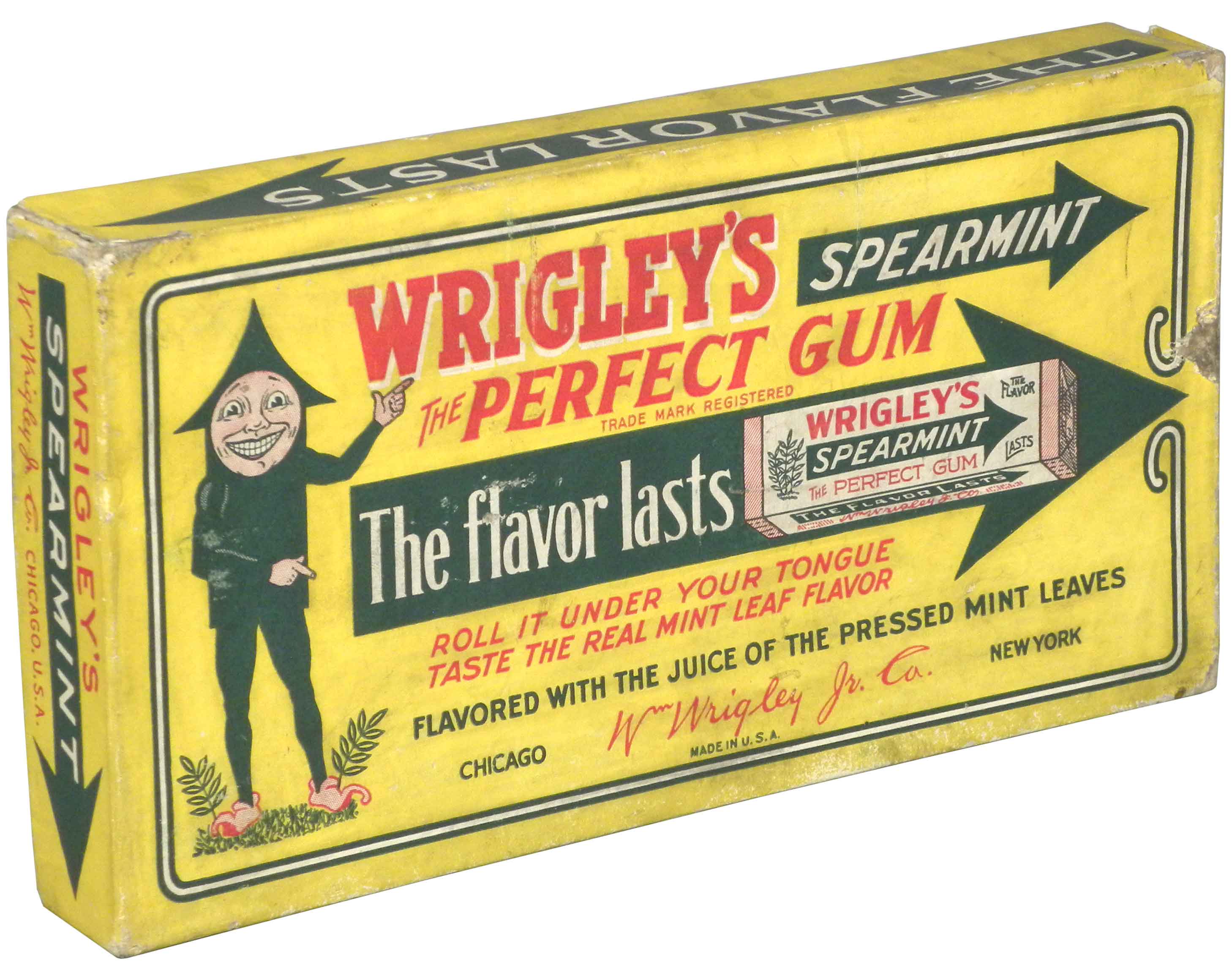 Wrigley's Spearmint Pepsin Gum Display Box. Some discoloration and paper loss at 3:00 otherwise very good condition. 8 1/2 X 4 1/2 X 1 1/4 inches.