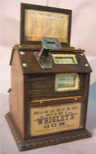 Wrigleys Gum Trade Stimulator, oak case. Circa 1899. Was given to dealers free with the purchase of 10 cases of gum. Mfg. by Johnas D. Bell & Co. One cent coin operated, says Drop in one cent and one cent or more worth of gum. 8 1/2 X 15 X 9 1/2 inches.