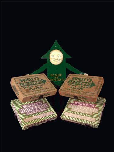 Wrigleys Tin Store Display with four Wrigleys gum boxes. Repaint on the display, boxes in fair to good condition. 13 1/2 inches tall.