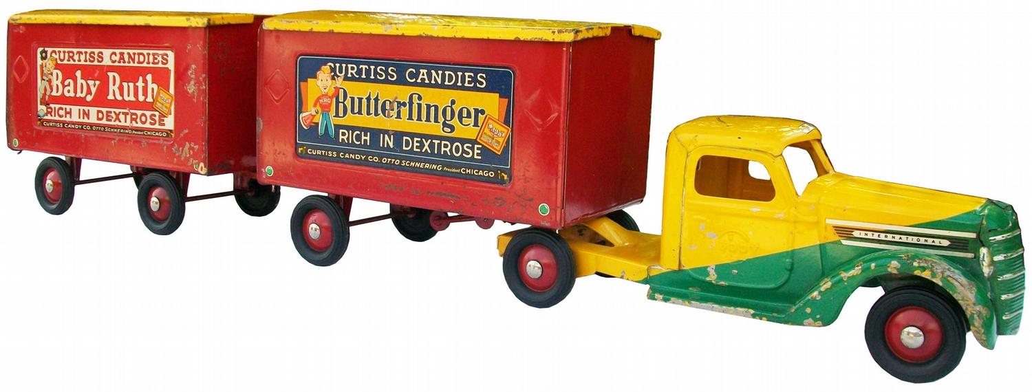 Buddy L Baby Ruth and Butterfinger Tanden Tractor Trailor Pressed Steel Toy Truck. Some paint loss mostly to top otherwise very good original paint and decals. 40 inches overall.