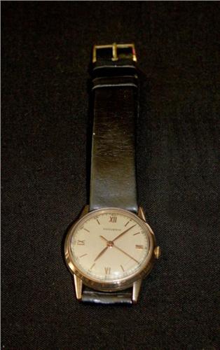 Montre-bracelet en or rose 18 cts, mouvement à remontage mécanique, signée HUGUENIN, cadran avec appliques or chiffres romains, seconde au centre, époque années 1960