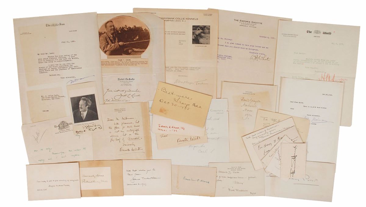 Collection of 26 items, consisting of letters and signatures, each signed by a notable writer, including: Albert Payson Terhune; Kenneth Roberts (2); Frances Parkinson Keyes; Channing Pollock; Joseph C. Lincoln; Fannie Hurst; Douglas Southall Freeman; Stephen Leacock; Richard Harding Davis; Bob Davis; O. O. McIntyre; John Kieran; J. P. McEvoy; Franklin P. Adams (2); Faith Baldwin; David Grayson [Ray Stannard Baker]; Ada Claire Darby; James Truslow Adams; William Allen White (2); James Branch Cabell; Quentin Reynolds; George Ade; and Herbert Bayard Swope. In overall very good to fine condition.