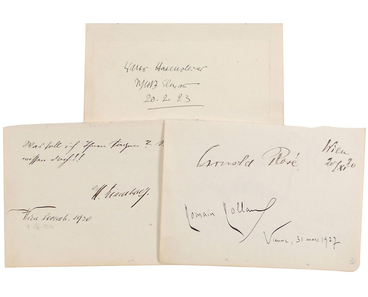 Vintage ink signatures of writers and musicians on both sides of three off-white 5 x 7 album pages (one on an affixed slip). Signers include: writers Romain Rolland, Walter Hasenclever, Franz Werfel, and Karl Kautsky; and musicians Arnold Rose (violinist), Linda Bandara (Dutch composer), and Gilbert Gravina. Scattered light toning and soiling, otherwise fine condition.