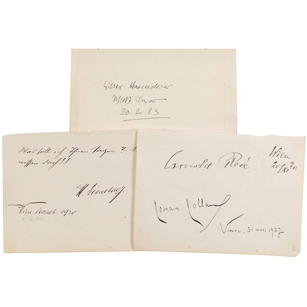 Vintage ink signatures of writers and musicians on both sides of three off-white 5 x 7 album pages (one on an affixed slip). Signers include: writers Romain Rolland, Walter Hasenclever, Franz Werfel, and Karl Kautsky; and musicians Arnold Rose (violinist), Linda Bandara (Dutch composer), and Gilbert Gravina. Scattered light toning and soiling, otherwise fine condition.
