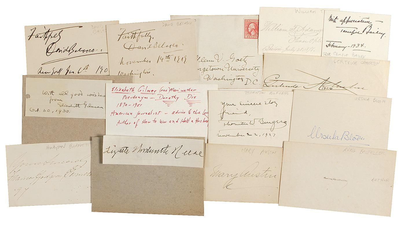 Ink signatures of 11 writers on individual various size slips and cards. Signers include: Frances Burnett, Thornton Burgess, Elizabeth Gilman, Ursula Bloom, Irene Bayles, David Baleso (2), Gertrude Atherton, William T. Adams, Mary Austin, Irving Bacheller, and Lizette Reese. In very good overall condition.