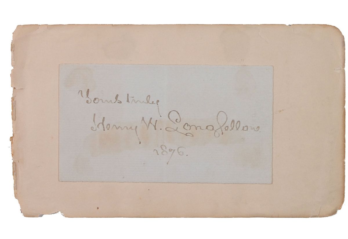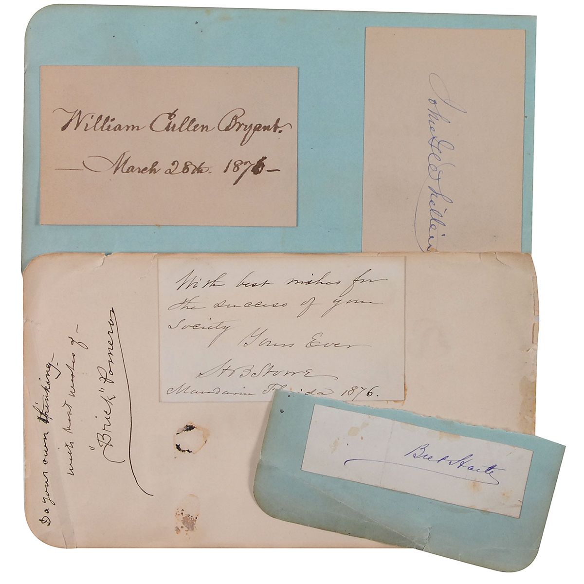 Five ink signatures of different writers on various size slips and cards affixed to album pages. Signers are: Henry W. Longfellow, Harriet Beecher Stowe, Bret Harte, William Cullen Bryant, and John Greenleaf Whittier. The Stowe and Longfellow signatures are affixed to opposite sides of the same page. Scattered show-through from adhesive and some light soiling, otherwise overall fine condition. The Longfellow, Harte, and Bryant signatures are all accompanied by full letters of authenticity from PSA/DNA. Provenance: William Collier Family Collection.