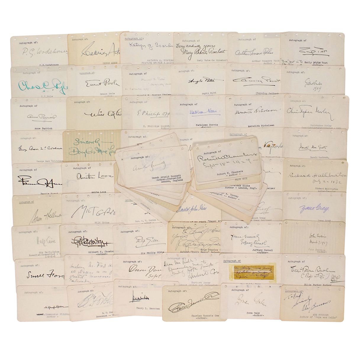 Impressive collection of approximately 125 signatures of writers from all genres, the vast majority in ink with a few in pencil, primarily on individual off-white 4.5 x 2.5 pages, some lined. Signers include: Jane Addams, Sherwood Anderson, G. K. Chesterton, Irvin S. Cobb, Erle Stanley Gardner, Zane Grey, Richard Halliburton, Fannie Hurst, Anita Loos, H. L. Mencken, Emily Post, Rafael Sabatini, Carl Sandburg, Upton Sinclair (pencil), Albert Payson Terhune, Thornton Wilder, P. G. Wodehouse, and Harold Bell Wright. In overall fine condition, with light edge toning.