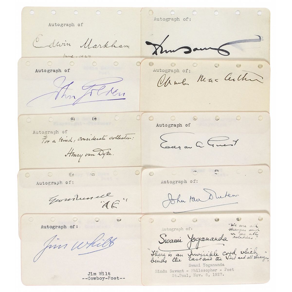 Collection of ten ink signatures of poets and playwrights on individual off-white 4.5 x 2.5 pages. Signers are: Lord Dunsany, Edgar Guest, Edwin Markham, Charles MacArthur, John Golden, Jim Whilt, John van Druten, Henry van Dyke, George ‘AE’ Russell, and Swami Yogananda. In overall fine condition.