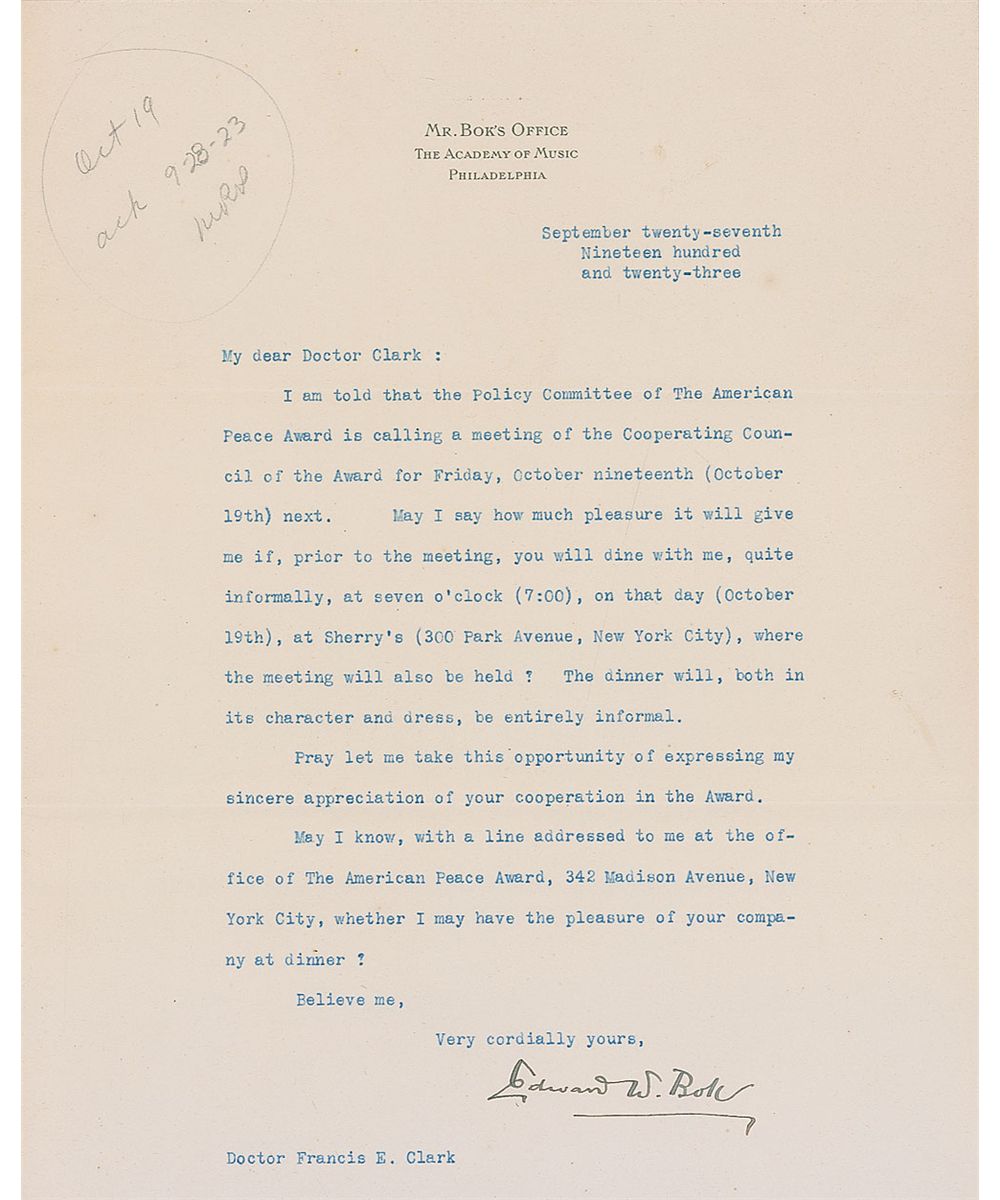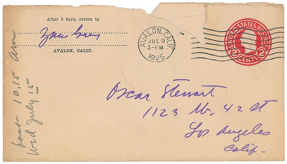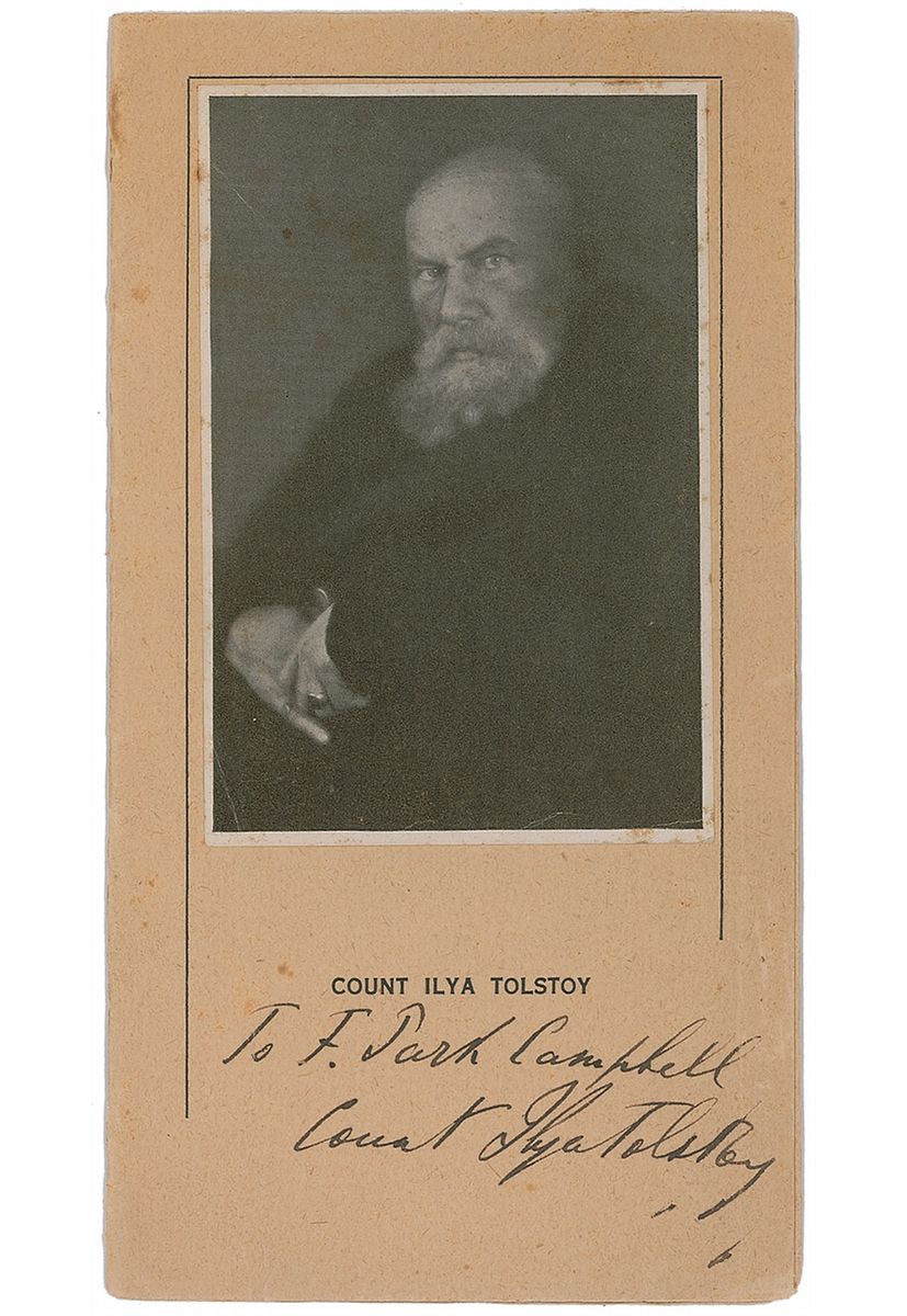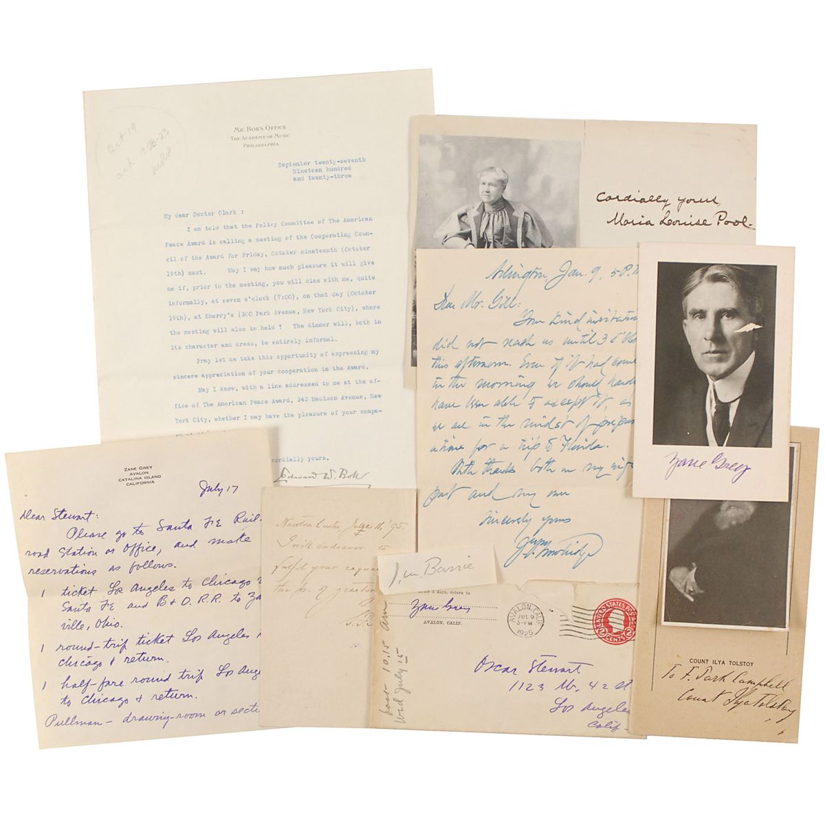 Collection of nine items, each signed by a writer, including: J. M. Barrie (signature), Edward Bok (TLS), Zane Grey (ALS, SP, and mailing envelope), Maria Louise Pool (signature), Samuel Francis Smith (ANS), Ilya Tolstoy (pamphlet), and John Townsend Trowbridge (ALS). In overall very good to fine condition.