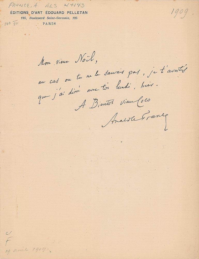 French author (1844–1924) who won the Nobel Prize in Literature in 1921. Untranslated ALS in French, one page, 6 x 7.75, Editions d’Art Edouard Pelletan letterhead, no date but annotated April 18, 1909 in pencil. In fine condition.