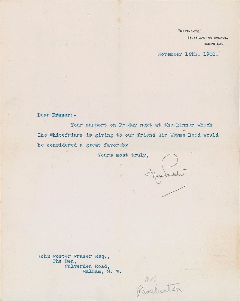 British mystery and adventure novelist (1863–1950). TLS, one page, 8 x 10, Heathcote letterhead, November 12, 1900. Letter to John Foster Fraser. In full: “Your support on Friday next at the Dinner which The Whitefriars is giving to our friend Sir Weyms Reid would be considered a great favor.” In fine condition.