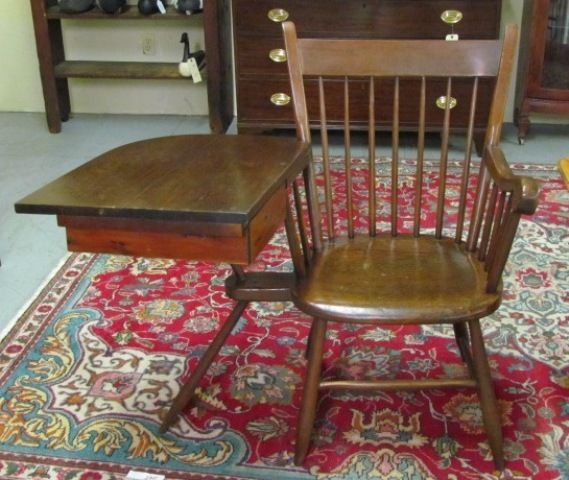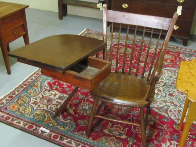 19th Century Windsor rare Straight Back Writing Arm Chair, 7 spindle back with drawer under writing surface