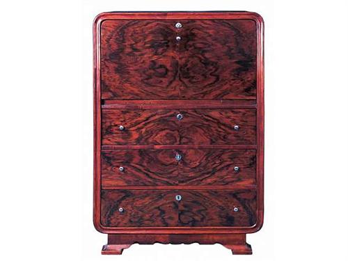 Walnut veneer, 3 drawers, door opening down, restored. Art Deco. Mid 20th century. Size: 125x86x47 cm.