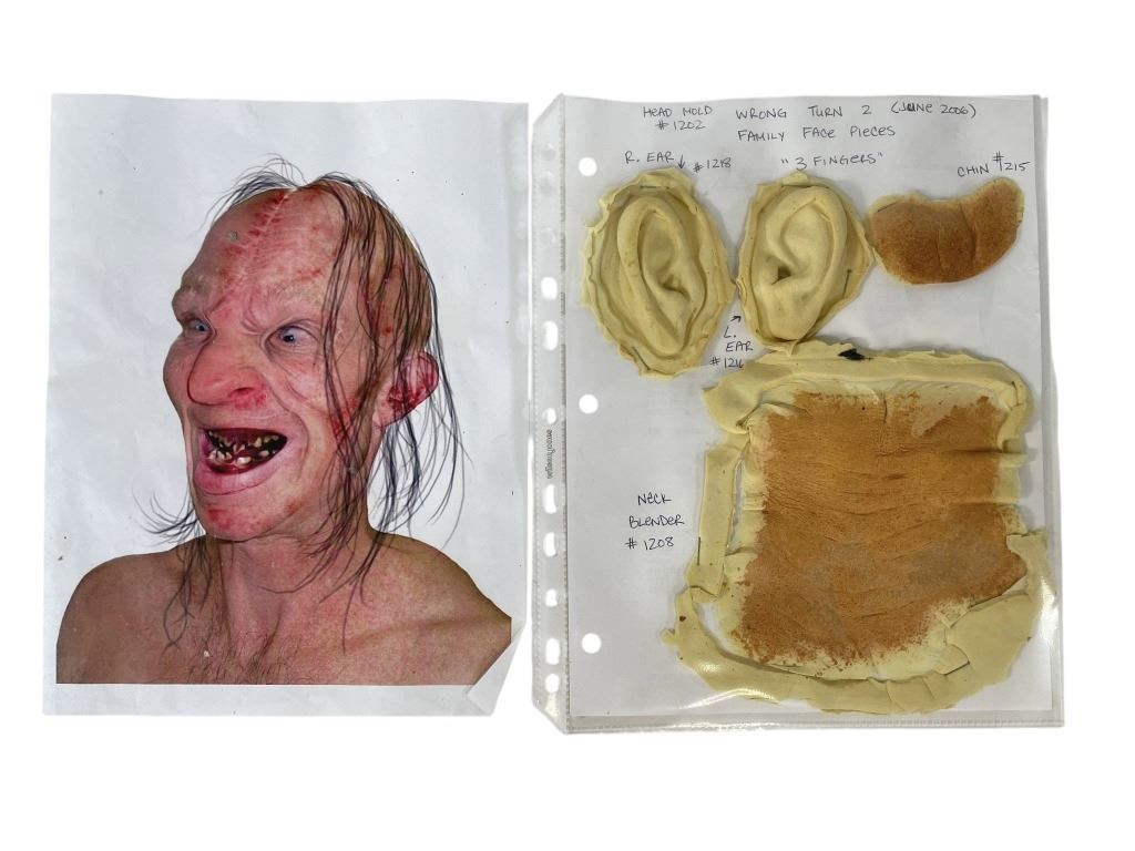 Original facial appliances (painted unused backups) made for "Three Finger", played by Jeff Scrutton in the Joe Lynch directed slasher film 'Wrong Turn 2: Dead End (2007), where a group of reality show contestants find themselves fighting for their survival against a family of hideously deformed inbred cannibals who plan to ruthlessly butcher them all.