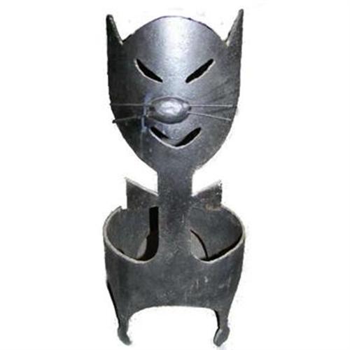 This vintage wrought iron planter depicts a kitty with whiskers. Measures 24" high and 11" wide/deep. Interior diameter is 10.25". Could accept a jardiniere or tall potted plant. No hallmarks and age and maker are unknown.