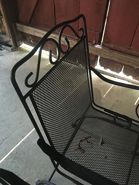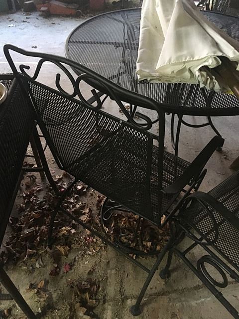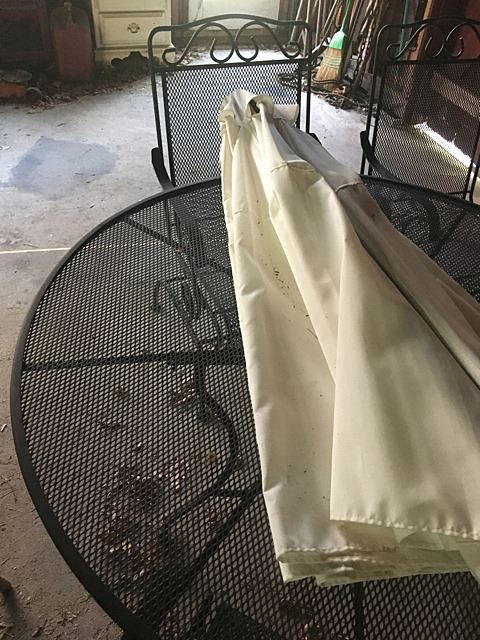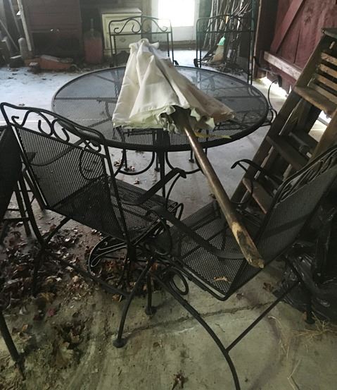 Black wrought iron table, 4 chairs, and umbrella patio set from the farm.