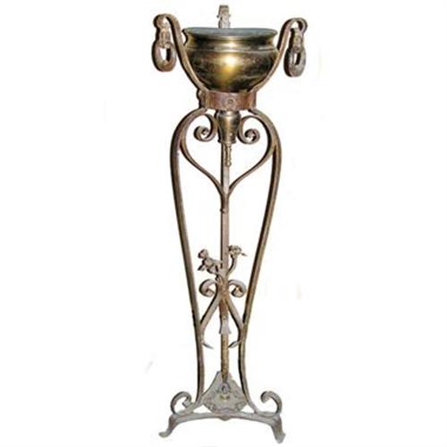 This lovely antique wrought iron plant stand has its original brass post with unique spring-loaded drain. Measures 48" high and 14.5" across. This item resides on the upper west side of Manhattan ( New York City ) and may be seen by appointment.