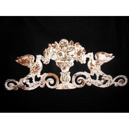 Ornate wrought iron wall hanging C.1900 perfect for garden wall or interior display. Depicting a tall urn of fruit with grapes spilling over the sides and two mythological creatures on either side. Scrolled garland supports all. Three holes are intact for attachment with large nails. Left in the original paint finish with iron work showing beneath. Excellent structural condition. Measures 28L X 11H X 1D.