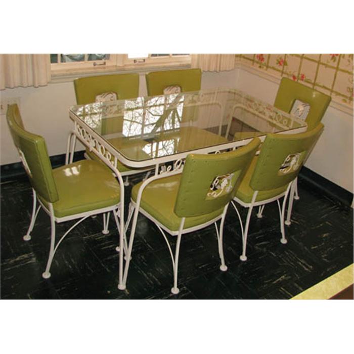 Title: Wrought Iron glass top table, en suite with six green vinyl upholstered chairs with grape and leaf decoration